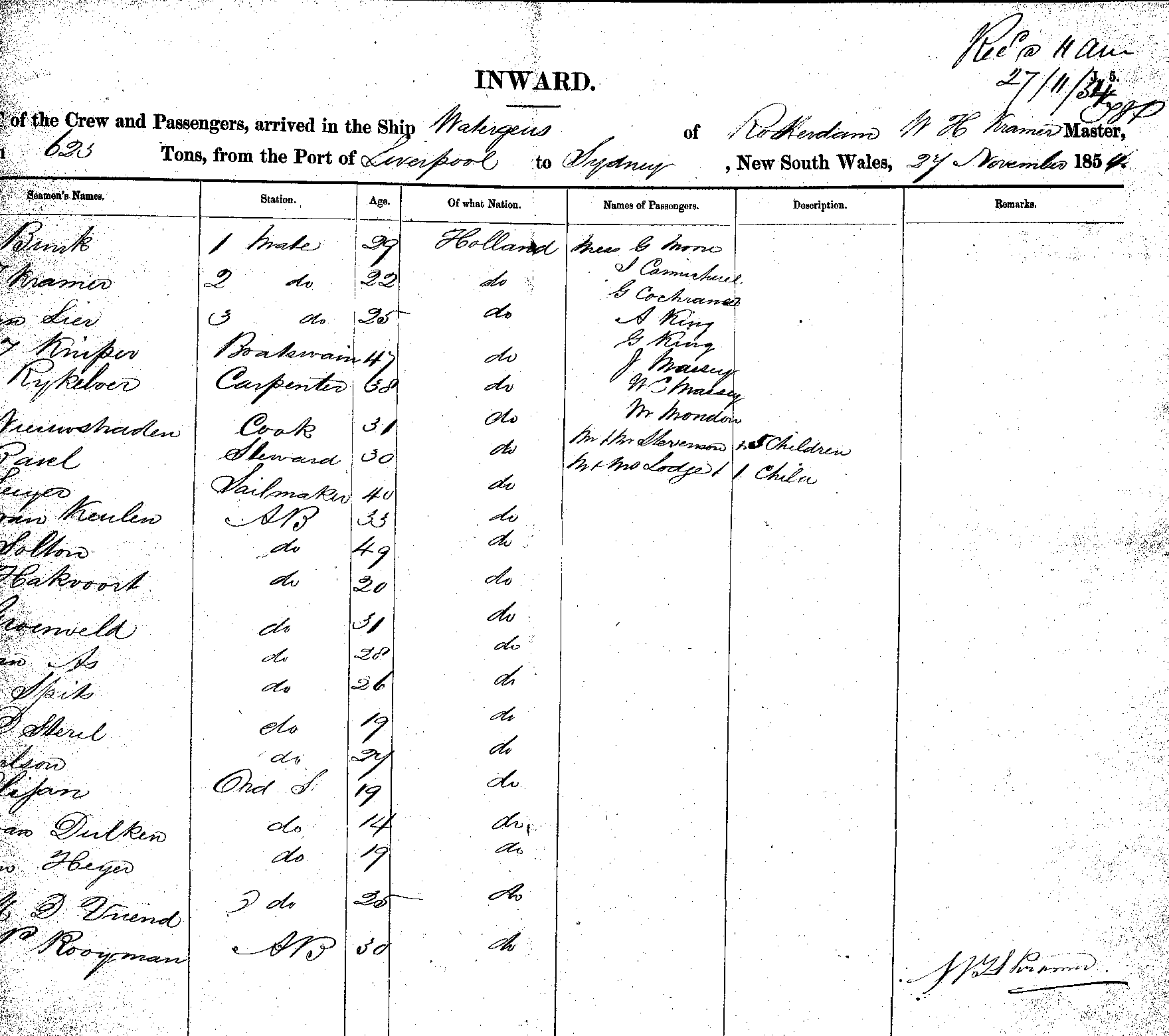 WATERGEUSOF ROTTERDAM, N H KRAMER, MASTER, BURTHEN 623 TONS FROM THE PORT OF LIVERPOOL TO SYDNEY, NEW SOUTH WALES, 27th NOVEMBER 1854 |