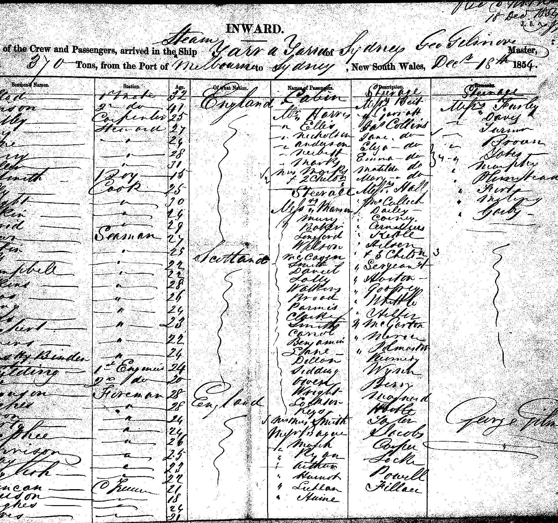 YARRA YARRASTEAM SHIP, OF SYDNEY, GEORGE GILMORE, MASTER, BURTHEN 370 TONS FROM THE PORT OF MELBOURNE TO SYDNEY, NEW SOUTH WALES, 18th DECEMBER, 1854 |