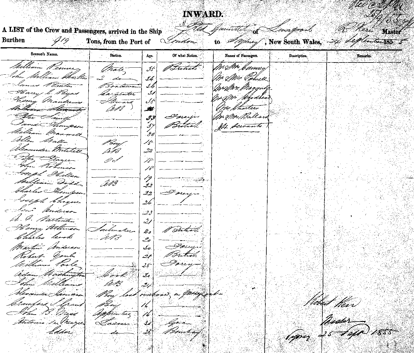 RED GAUNTLETOF LIVERPOOL, ROBERT KERR, MASTER, BURTHEN 919 TONS FROM THE PORT OF LONDON TO SYDNEY, NEW SOUTH WALES, 24TH SEPTEMBER 1855 |