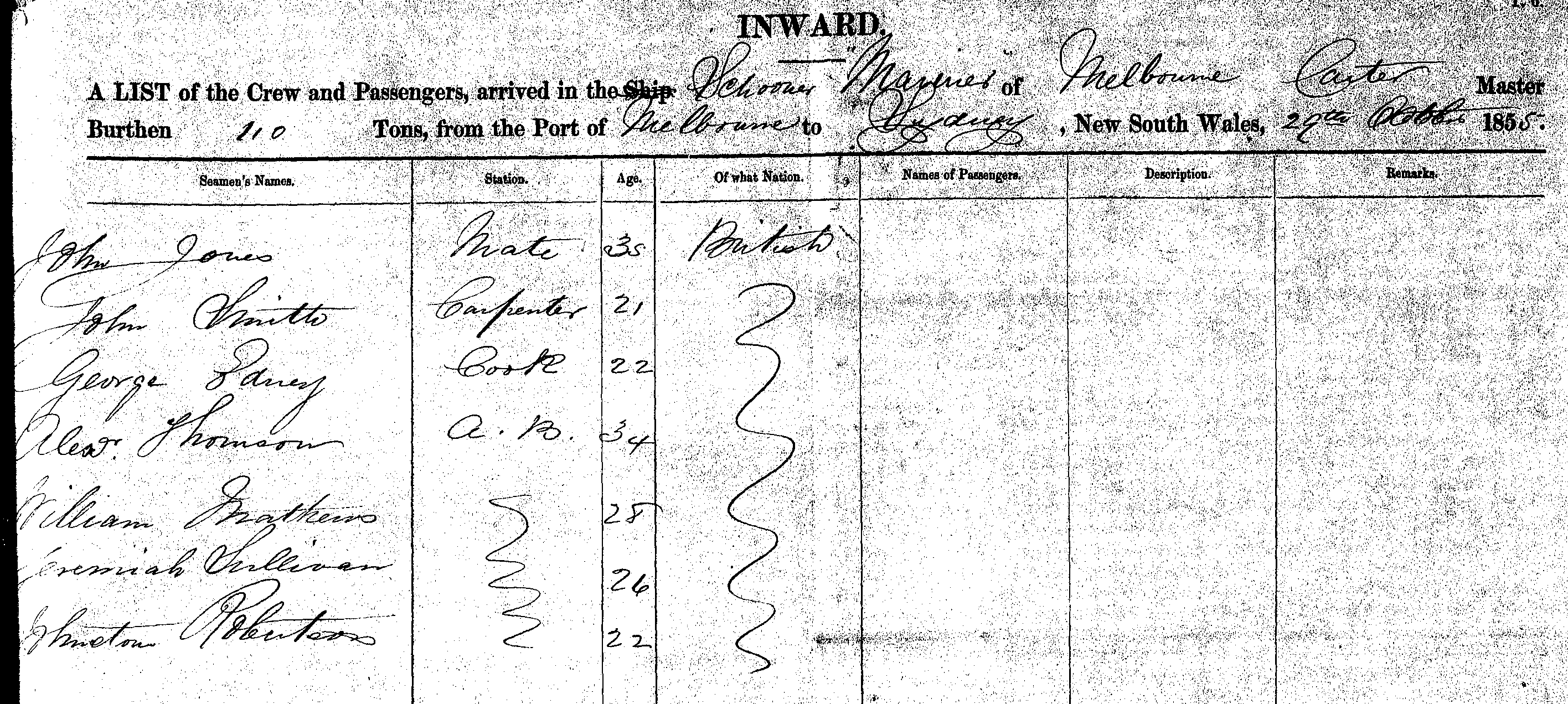 MARINERSCHOONER OF MELBOURNE, CARTER MASTER, BURTHEN 110 TONS FROM THE PORT OF MELBOURNE TO SYDNEY NEW SOUTH WALES, 29TH OCTOBER 1855 |