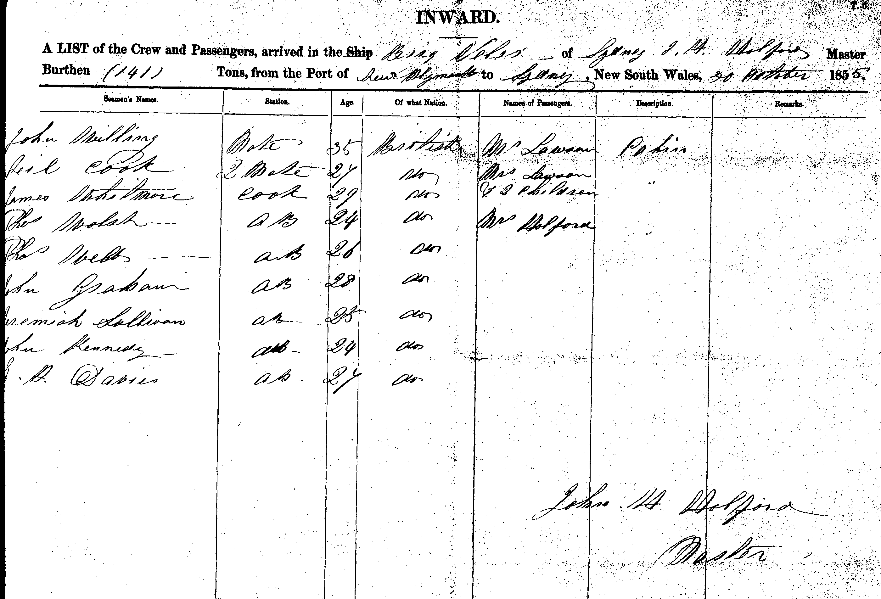 VELOXBRIG OF SYDNEY, JOHN HOLFORD MASTER, BURTHEN 141 TONS FROM THE PORT OF PLYMOUTH TO SYDNEY NEW SOUTH WALES, ? OCTOBER 1855 |