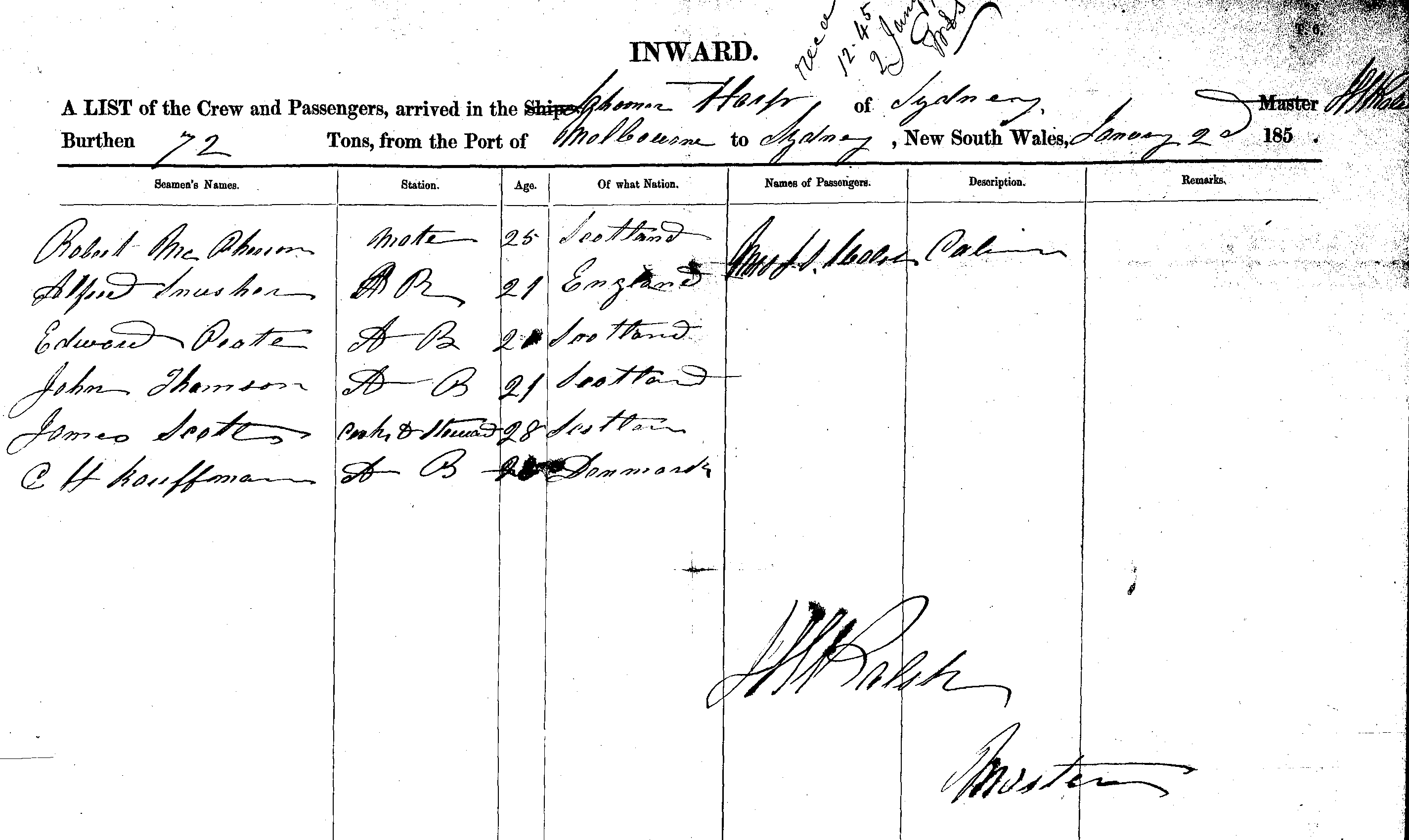 HARPSCHOONER, OF SYDNEY, J.H.RALSH MASTER, BURTHEN 72 TONS FROM THE PORT OF MELBOURNE TO SYDNEY NEW SOUTH WALES, 2ND JANUARY 1856 |
