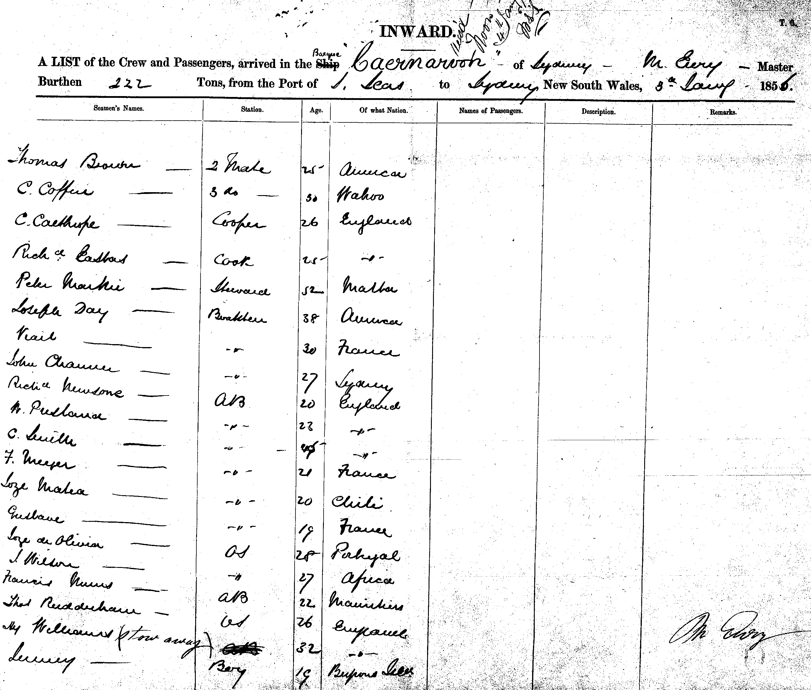 CAERNARWOHBARQUE OF SYDNEY, M. EWRY MASTER, BURTHEN 22 TONS FROM THE PORT OF SOUTH SEAS TO SYDNEY NEW SOUTH WALES, 3RD JANUARY 1856 |