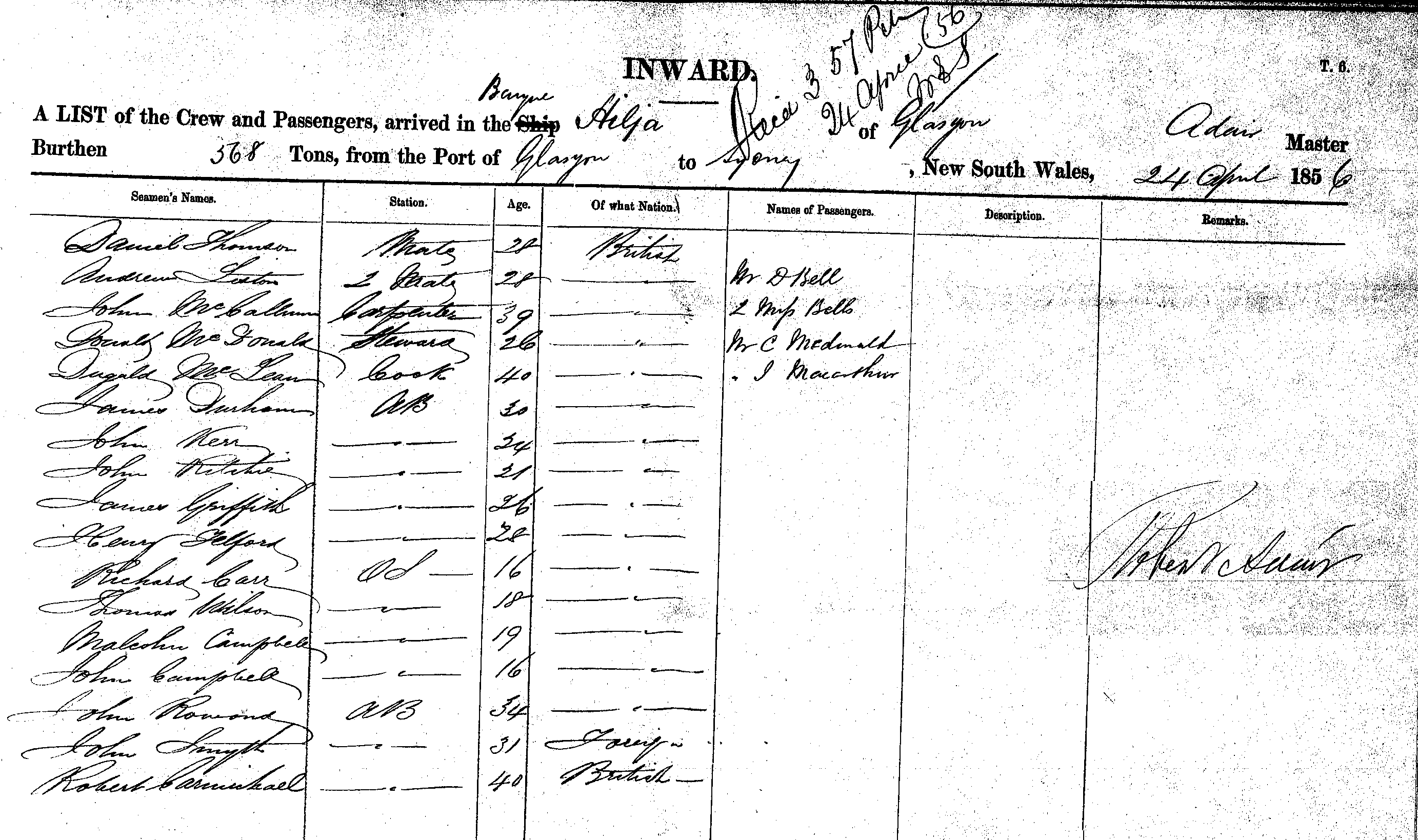 HILJABARQUE, OF GLASGOW, ROBERT ADAMS MASTER, BURTHEN 568 TONS FROM THE PORT OF GLASGOW TO SYDNEY, NEW SOUTH WALES, 24TH APRIL 1856 |