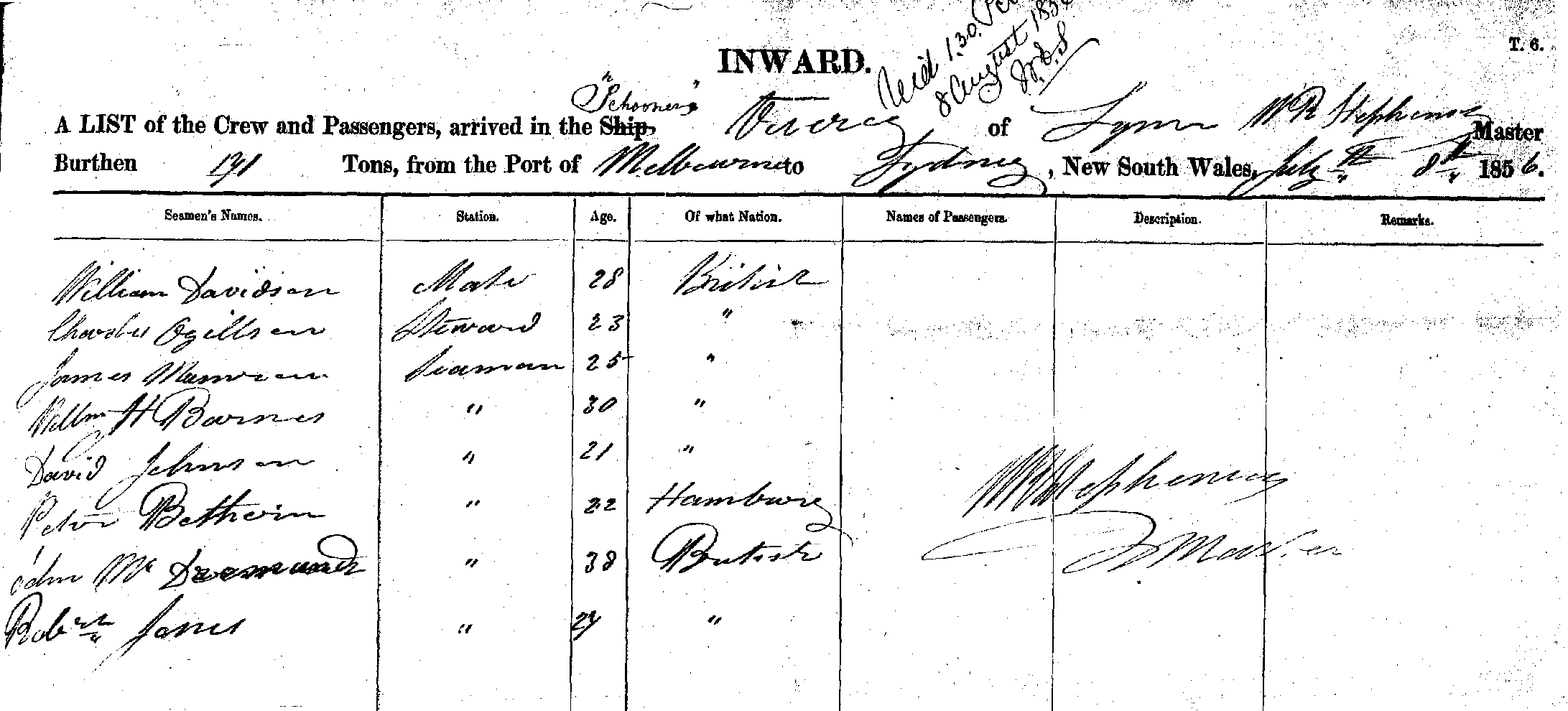 VICEROYOF LYME, W. R. STEPHENSON, MASTER, BURTHEN 171 TONS FROM THE PORT OF MELBOURNE TO SYDNEY, NEW SOUTH WALES, 8TH JULY 1856 |
