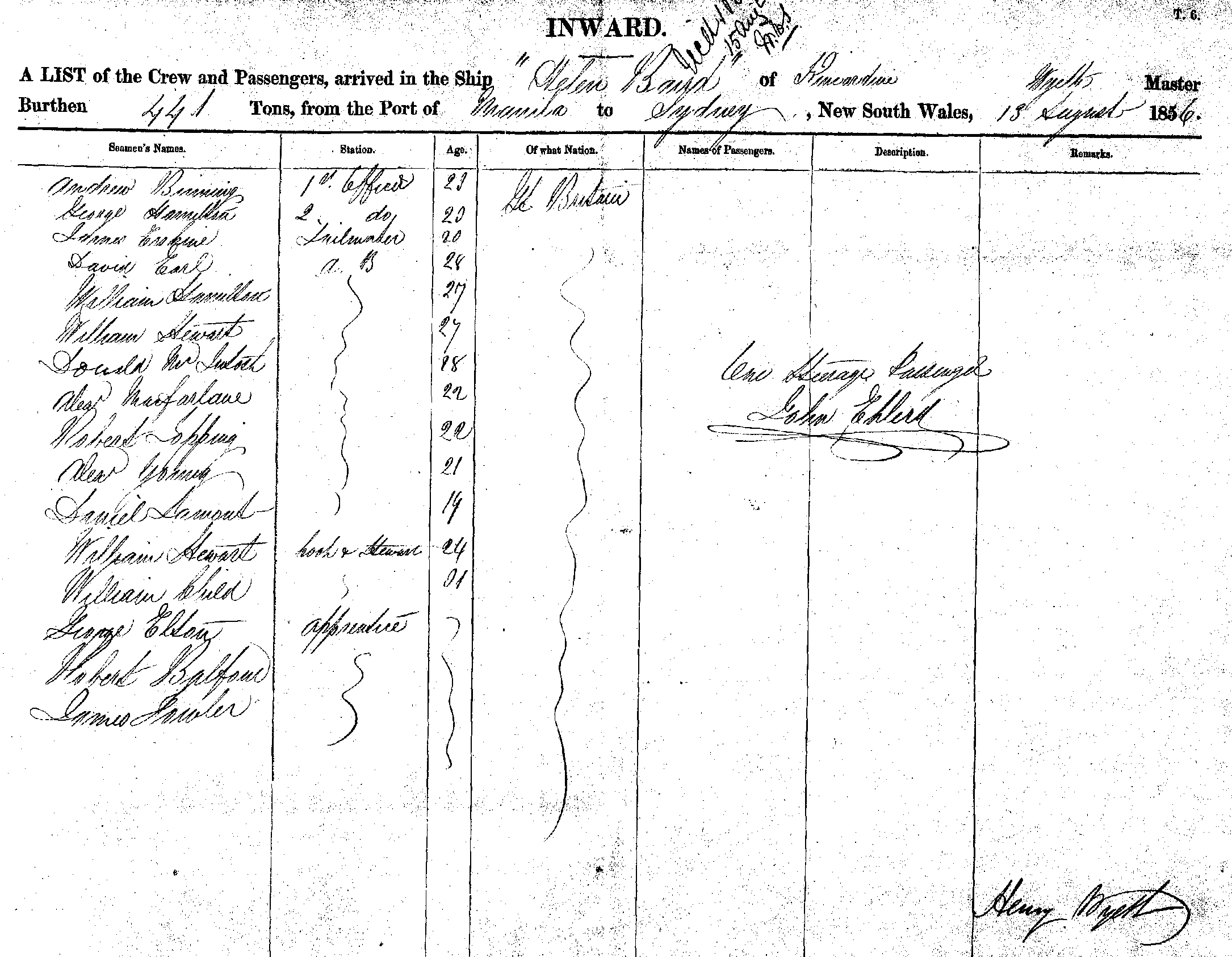HELEN BAIRDOF KINCARDINE, HENRY WYETH, MASTER, BURTHEN 441 TONS FROM THE PORT OF MANILA TO SYDNEY, NEW SOUTH WALES, 15TH AUGUST 1856 |