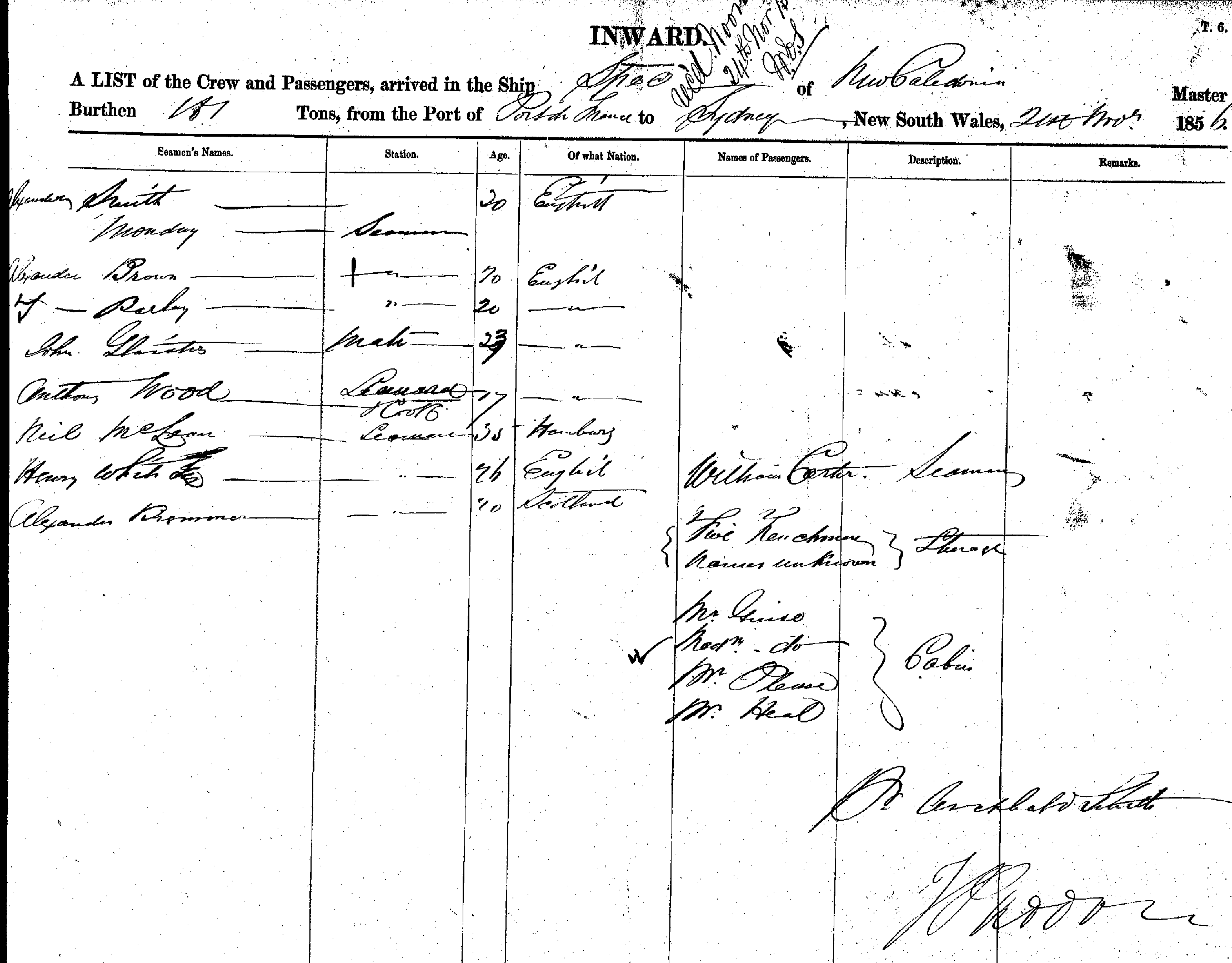 SPEC SHIP OF NEW CALEDONIA, ?, MASTER, BURTHEN 181 TONS FROM THE PORT OF PORT DE FRANCE TO SYDNEY, NEW SOUTH WALES, 21ST NOVEMBER, 1856 |
