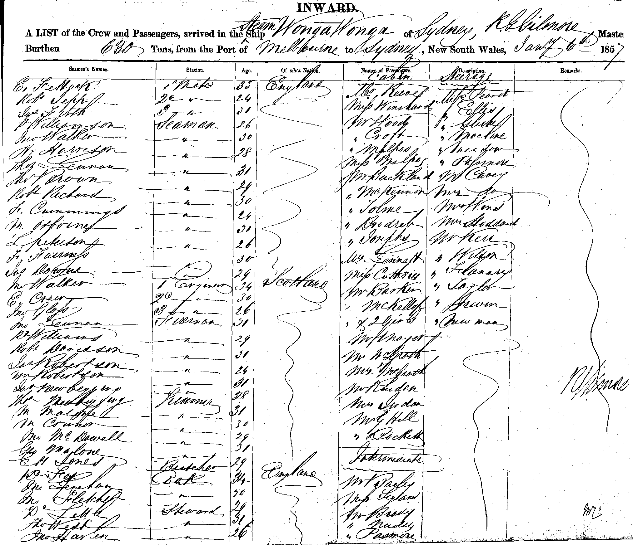 WONGA WONGAOF SYDENY, R G GILMORE, MASTER, BURTHEN 630 TONS FROM THE PORT OF MELBOURNE TO SYDNEY, NEW SOUTH WALES,6TH JANUARY 1857 |