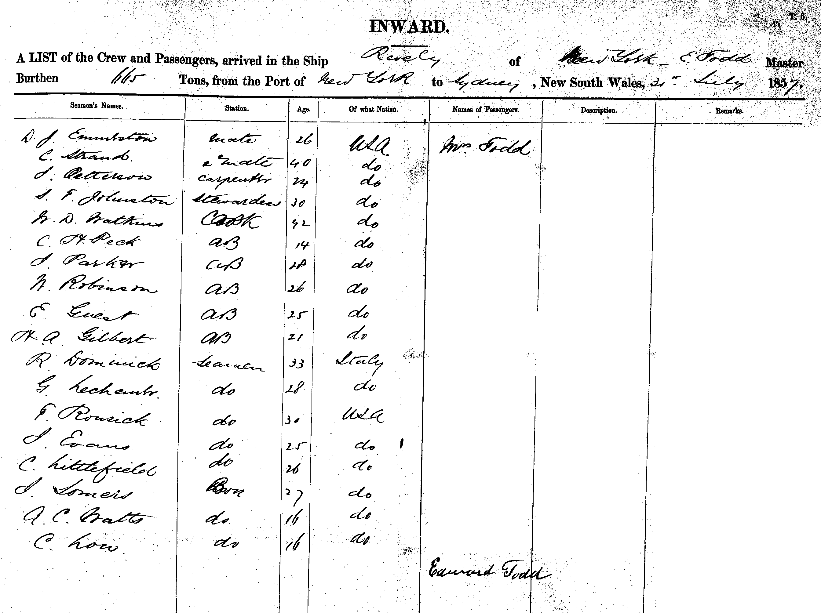 REVELYOF NEW YORK, EDWARD TODD, MASTER, BURTHEN 665 TONS FROM THE PORT OF NEW YORK TO SYDNEY, NEW SOUTH WALES, 31 JULY 1857 |