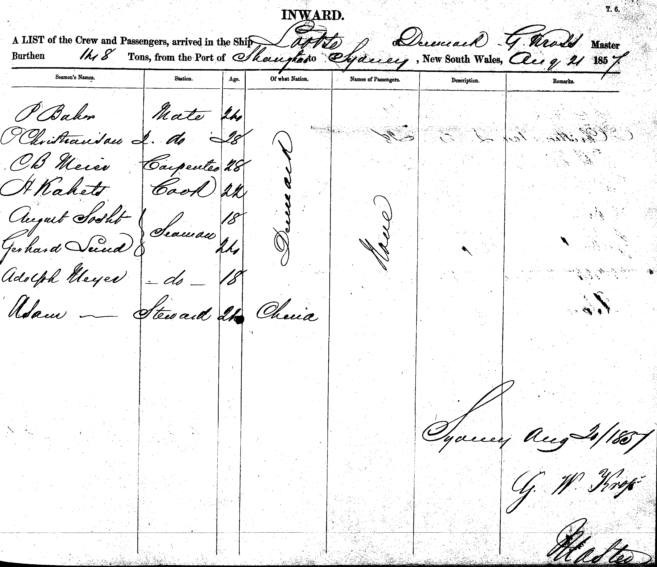 LOOTSEOF DENMARK G KLOSS MASTER, BURTHEN 148 TONS FROM THE PORT OF SHANGHAI TO SYDNEY, NEW SOUTH WALES, 21ST AUGUST 1857 |