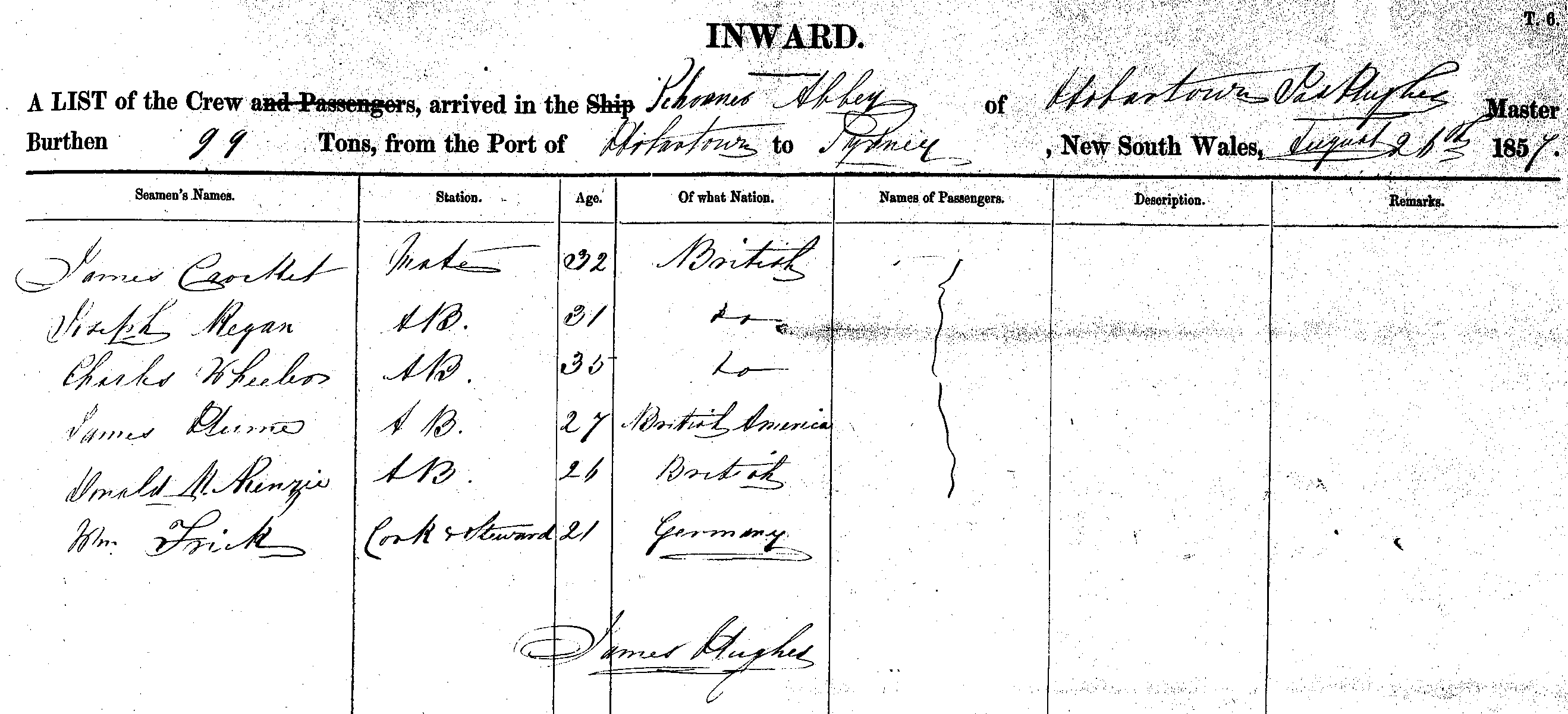 ABBEYSCHOONER OF HOBERT TOWN JAMES HUGHES MASTER, BURTHEN 99 TONS FROM THE PORT OF HOBART TOWN TO SYDNEY, NEW SOUTH WALES, 26TH AUGUST 1857 |