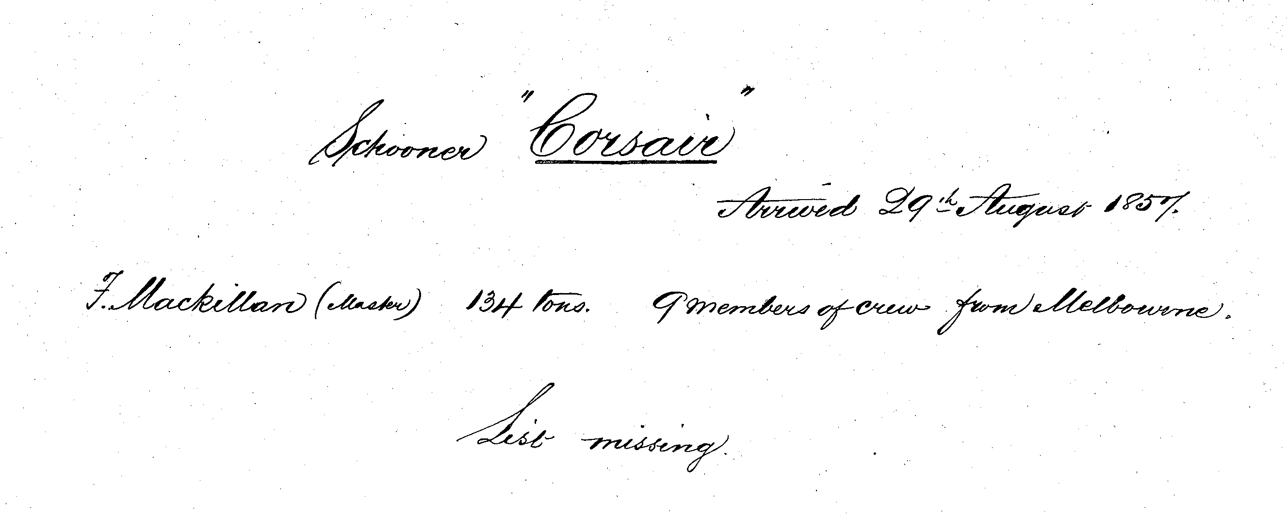 CORSAIRof ?, F Mackillan Master, Burthen 134 TONS FROM the Port of ? to Sydney, New South Wales, 29th August 1857 |