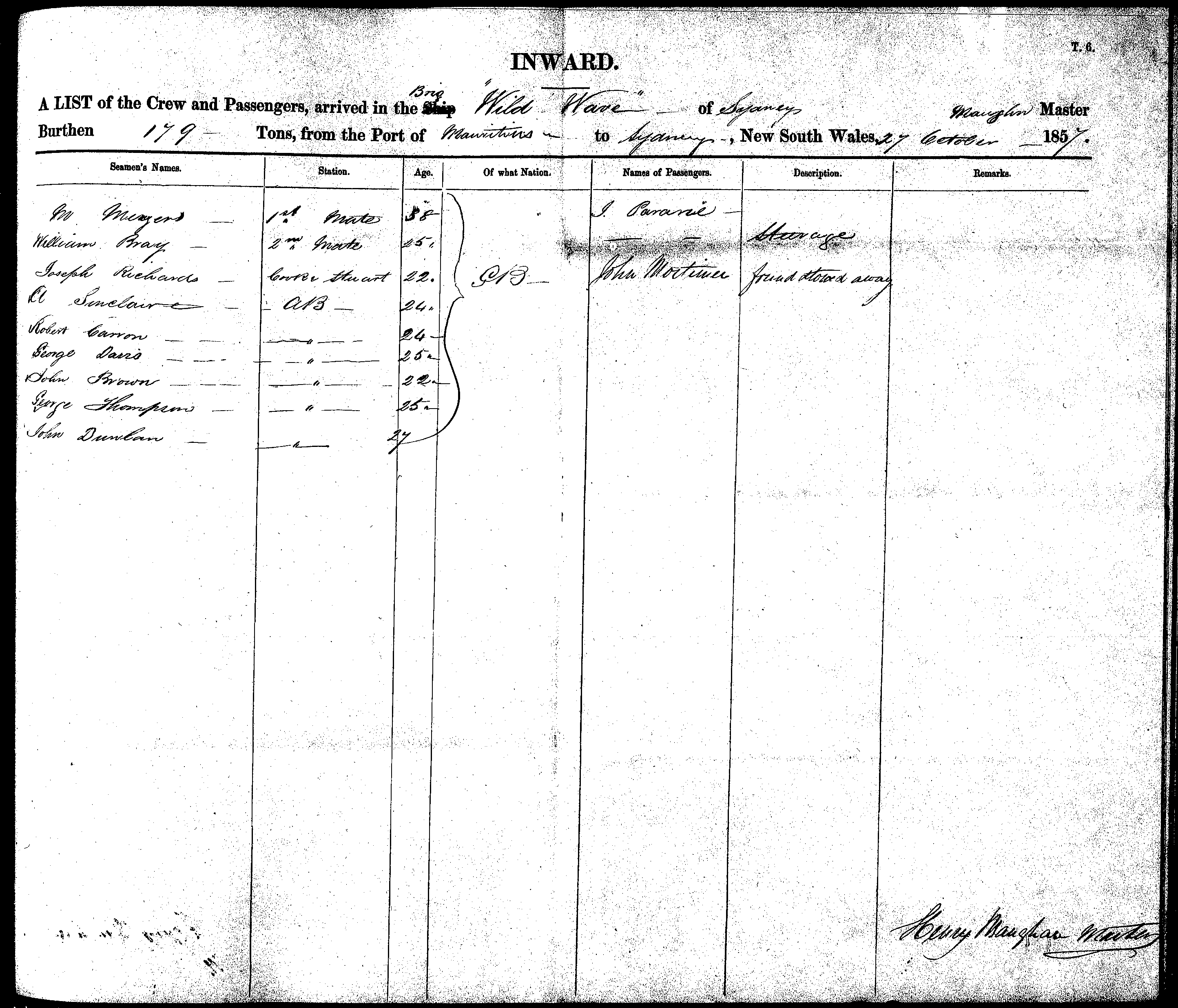 WILD WAVEBrig of Sydney Henry Maughan Master, Burthen 179 Tons from the Port of Mauritius to Sydney, New South Wales, 27th Oct 1857 |