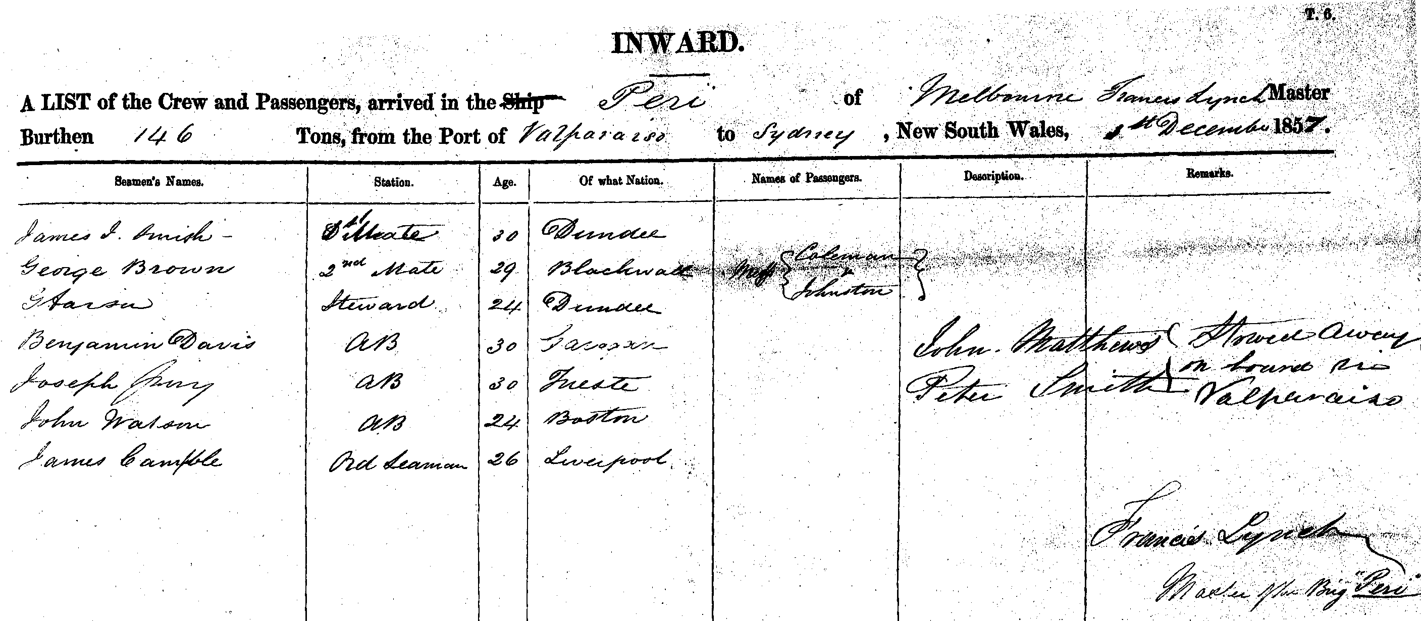 PERIOF MELBOURNE, FRANCIS LYNCH, MASTER, BURTHEN 146 TONS FROM THE PORT OF VALPARAISO TO SYDNEY, NEW SOUTH WALES, 1ST DEC 1857 |
