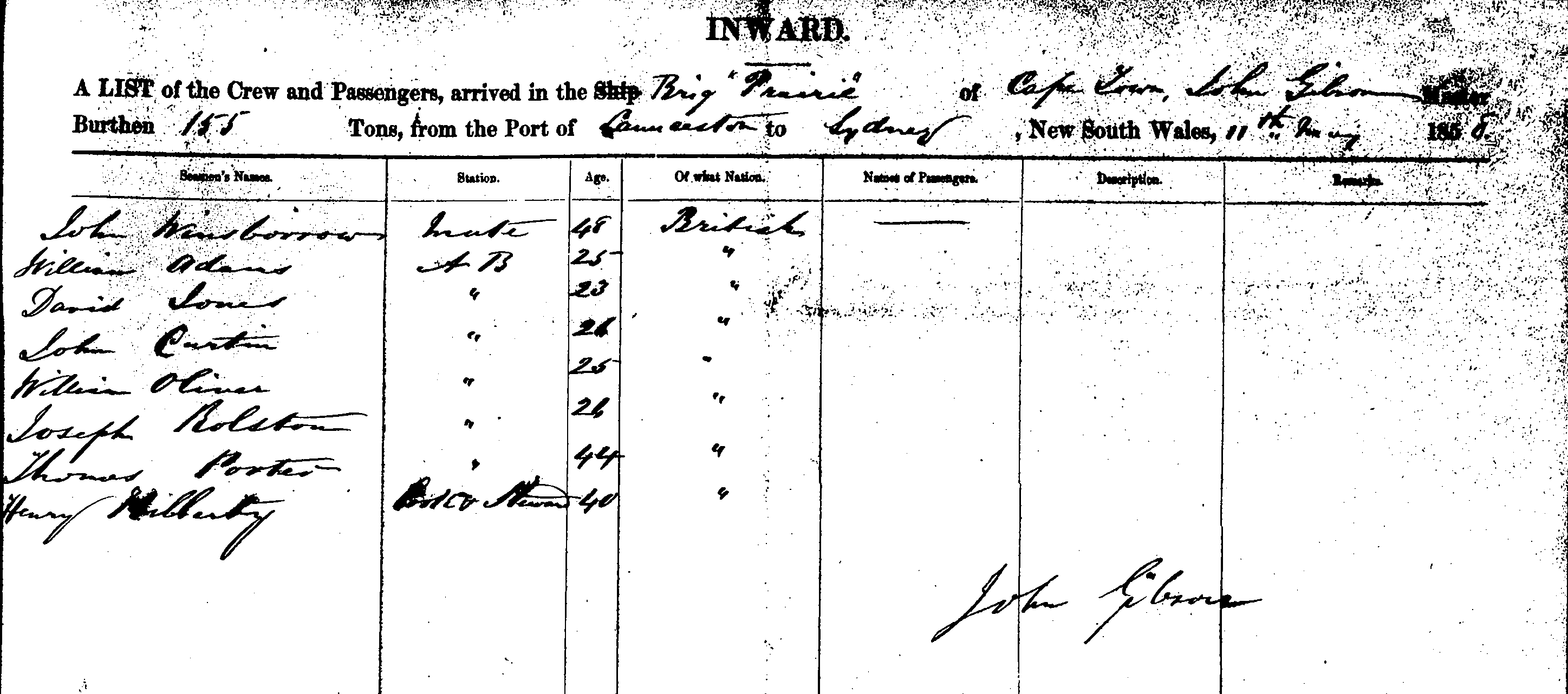 PRAIRIEBRIG OF CAPE TOWN, GIBSON, MASTER, BURTHEN 155 TONS FROM THE PORT OF LAUNCESTON TO SYDNEY, NEW SOUTH WALES, 11TH MAY 1858 |
