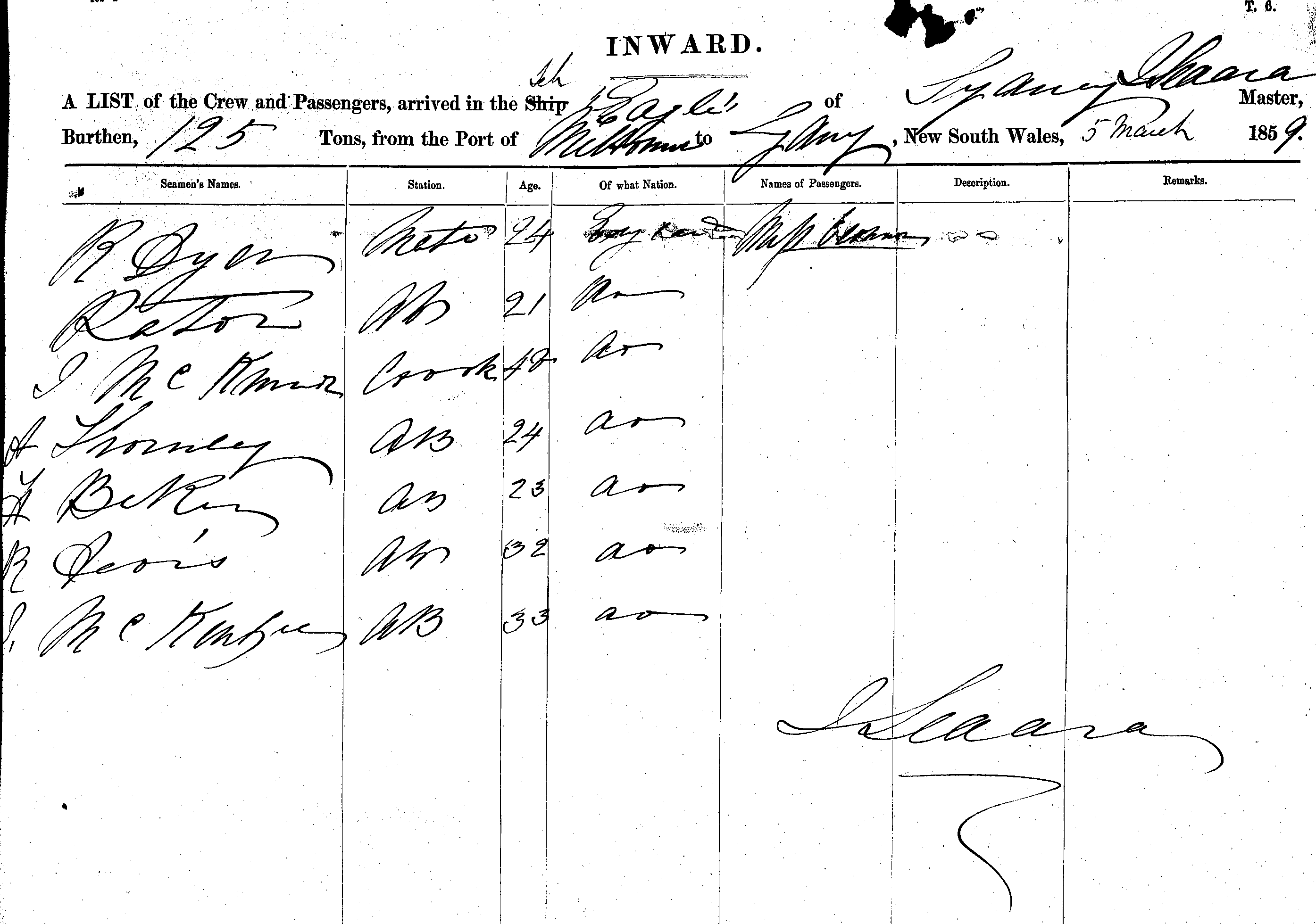 EAGLEOF SYDNEY J SEAARA MASTER, BURTHEN 125 TONS, FROM THE PORT OF MELBOURNE TO SYDNEY, NEW SOUTH WALES 5 MARCH 1859 |