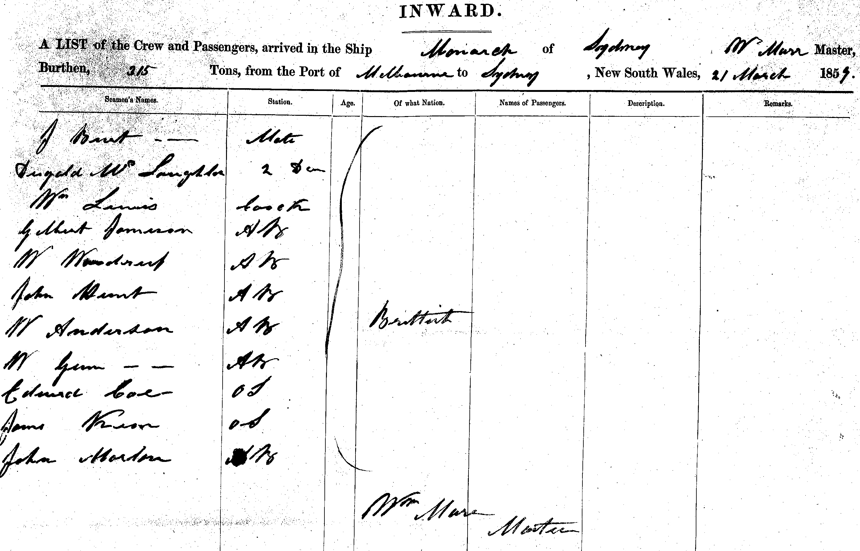 MONARCHOF SYDNEY WILLIAM MARE, MASTER, BURTHEN 315 TONS FROM THE PORT OF MELBOURNE TO SYDNEY NEW SOUTH WALES 21 MARCH 1859 |