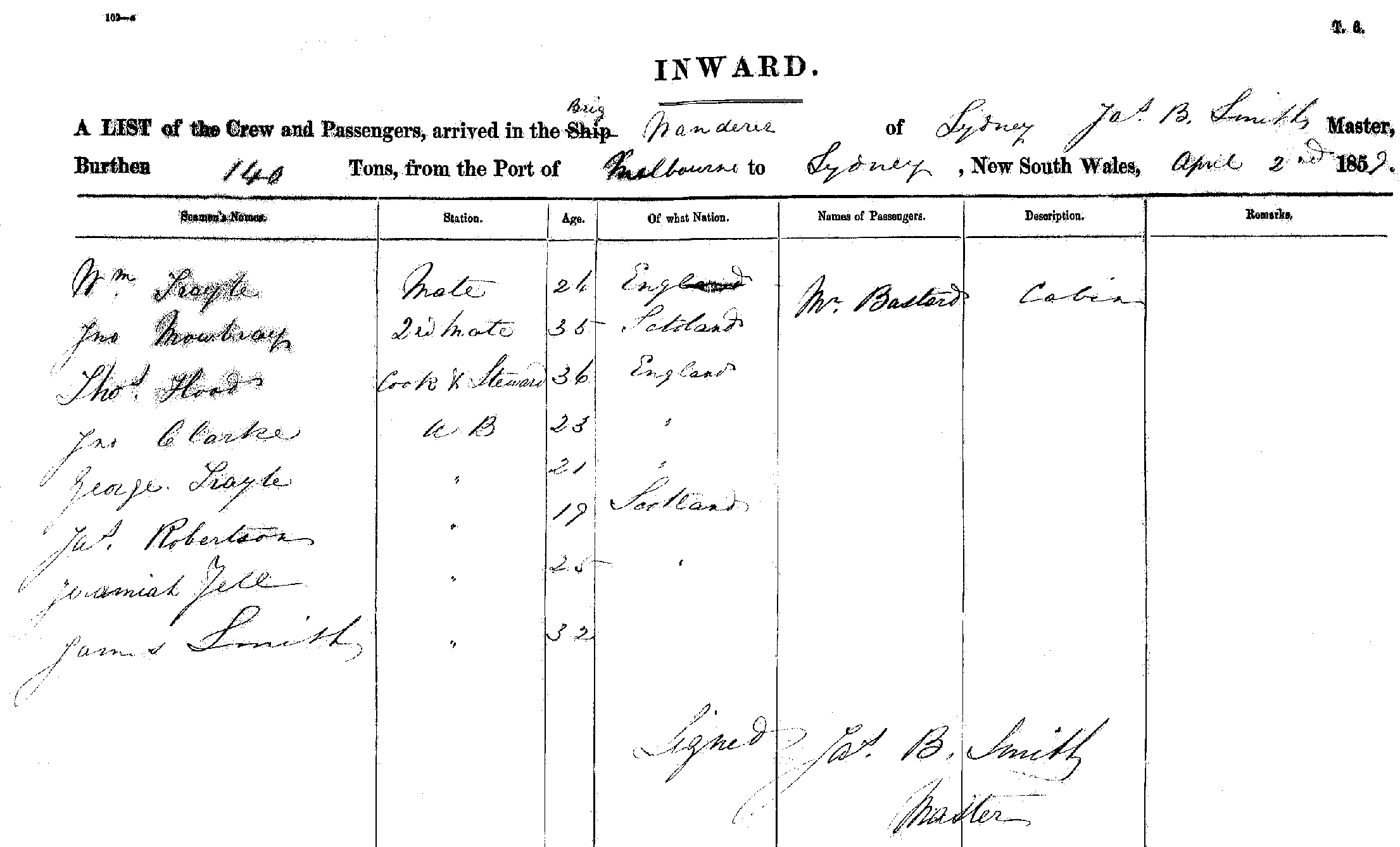 WANDERERBRIG, OF SYDNEY, JAMES B.SMITH, MASTER, BURTHEN 140 TONS FROM THE PORT OF MELBOURNE TO SYDNEY, NEW SOUTH WALES, 2ND APRIL, 1859 |