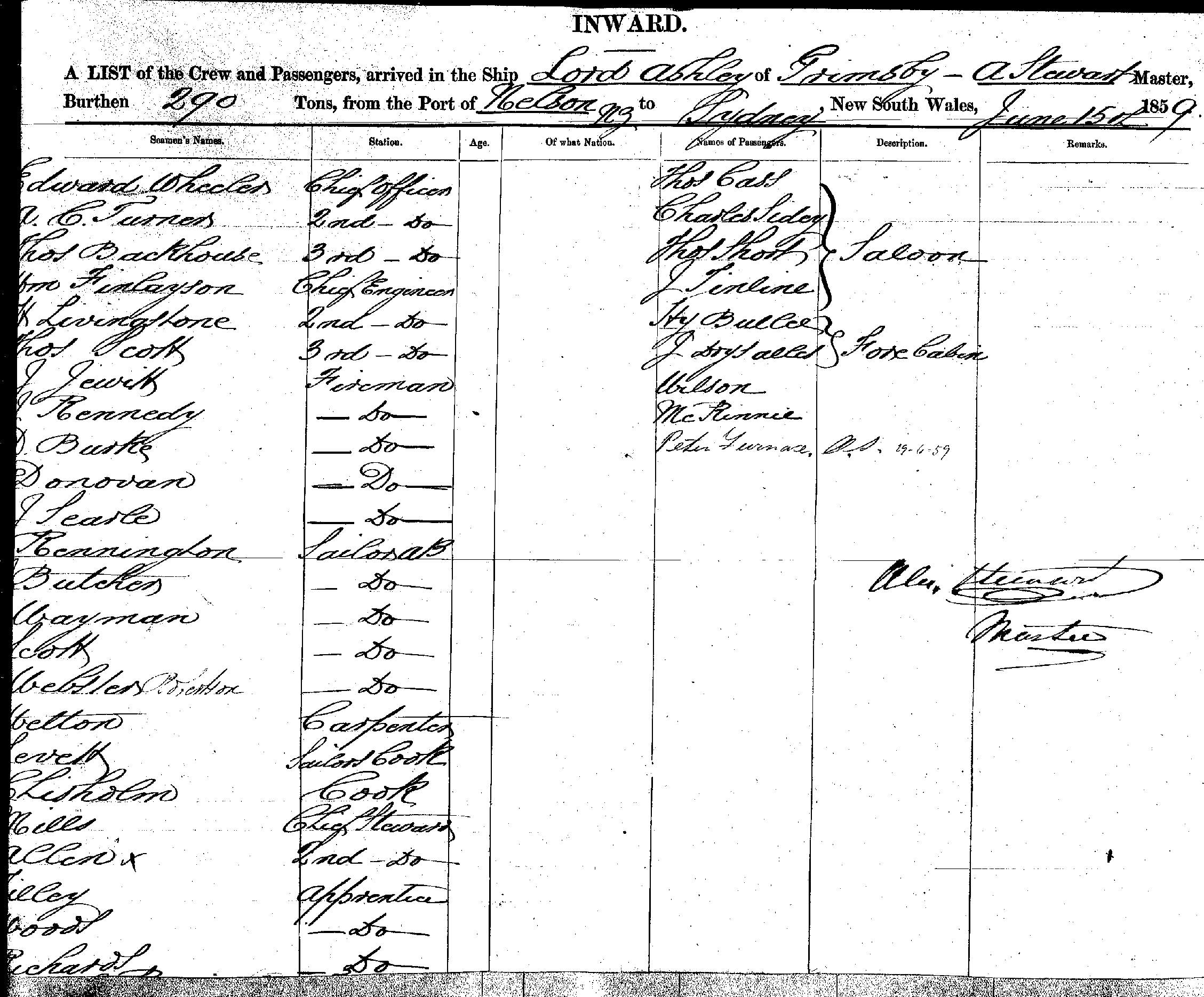 LORD ASHLEYOF GRIMSBY, A STEWART, MASTER, BURTHEN 290 TONS FROM THE PORT OF NELSON NZ TO SYDNEY, NEW SOUTH WALES, 15 JUNE 1859 BURTHEN 290 TONS |
