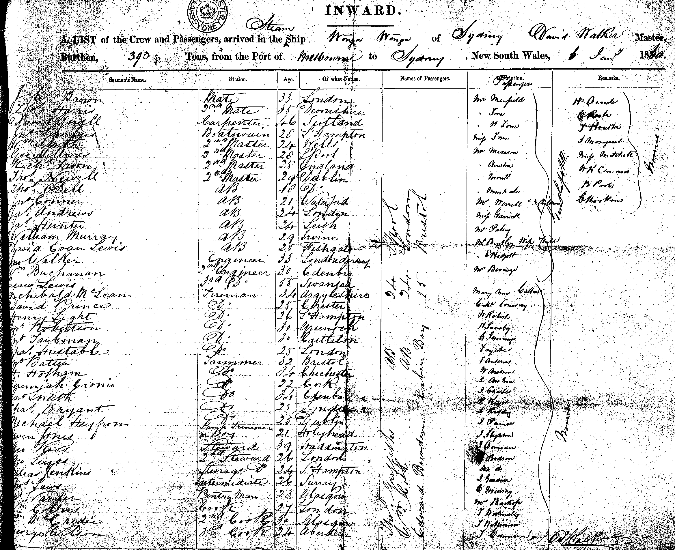WONGA WONGASTEAMSHIP OF SYDNEY, DAVID WALKER, MASTER, BURTHEN 393 TONS FROM THE PORT OF MELBOURNE TO SYDNEY, NEW SOUTH WALES, 6TH JANUARY, 1860 |