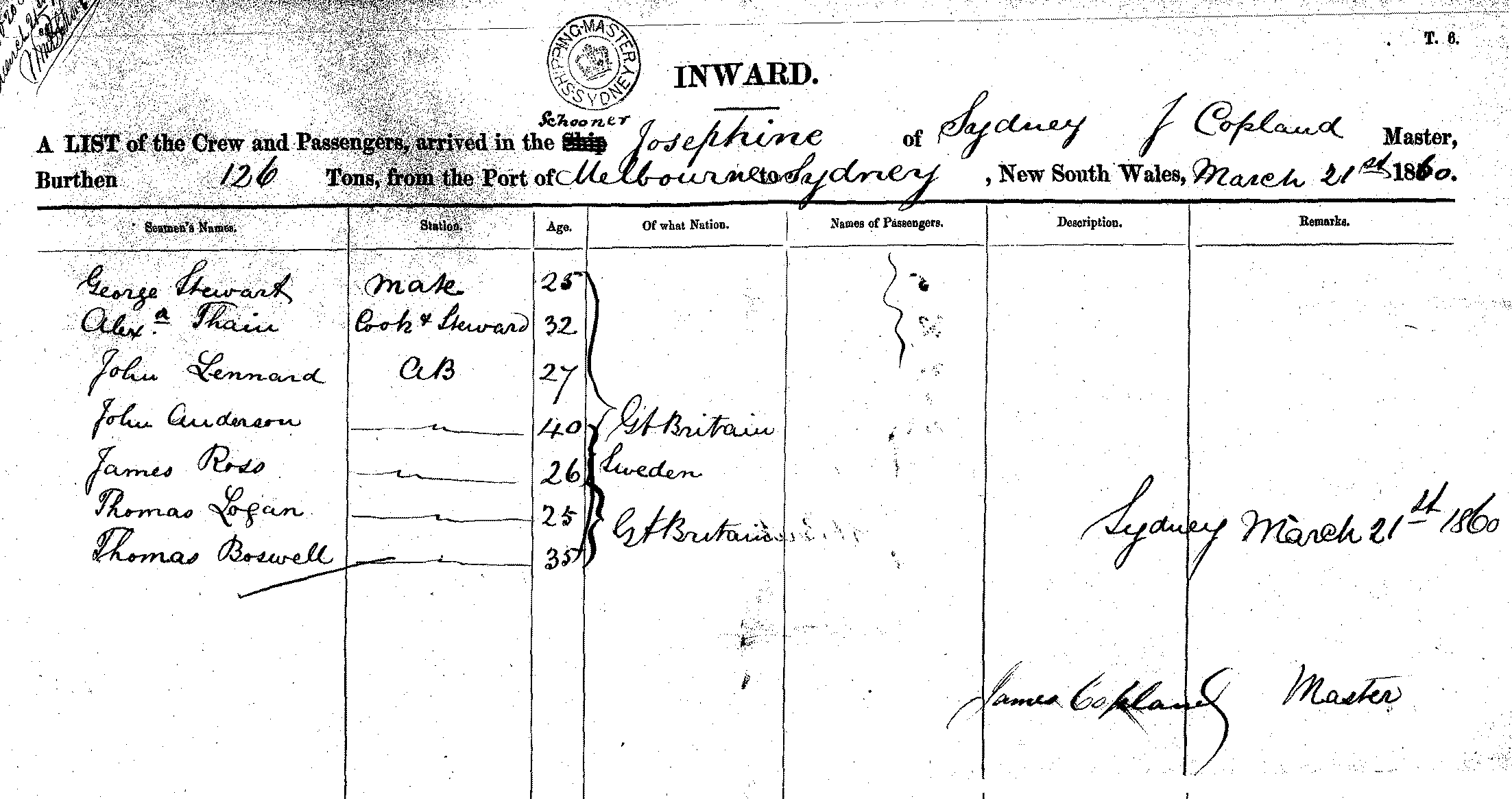 JOSEPHINESCHOONER OF SYDNEY, JAMES COPLAND, MASTER, BURTHEN 126 TONS FROM THE PORT OF MELBOURNE TO SYDNEY, NEW SOUTH WALES, 21ST MARCH 1860 |