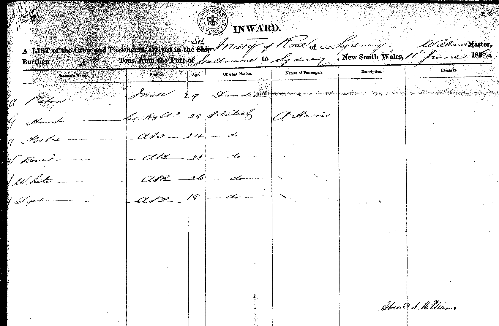 MARY AND ROSESCHOONER OF SYDNEY, EDWIN S. WILLIAMS, MASTER, BURTHEN 86 TONS FROM THE PORT OF MELBOURNE TO SYDNEY, NEW SOUTH WALES, 11TH JUNE 1860 |