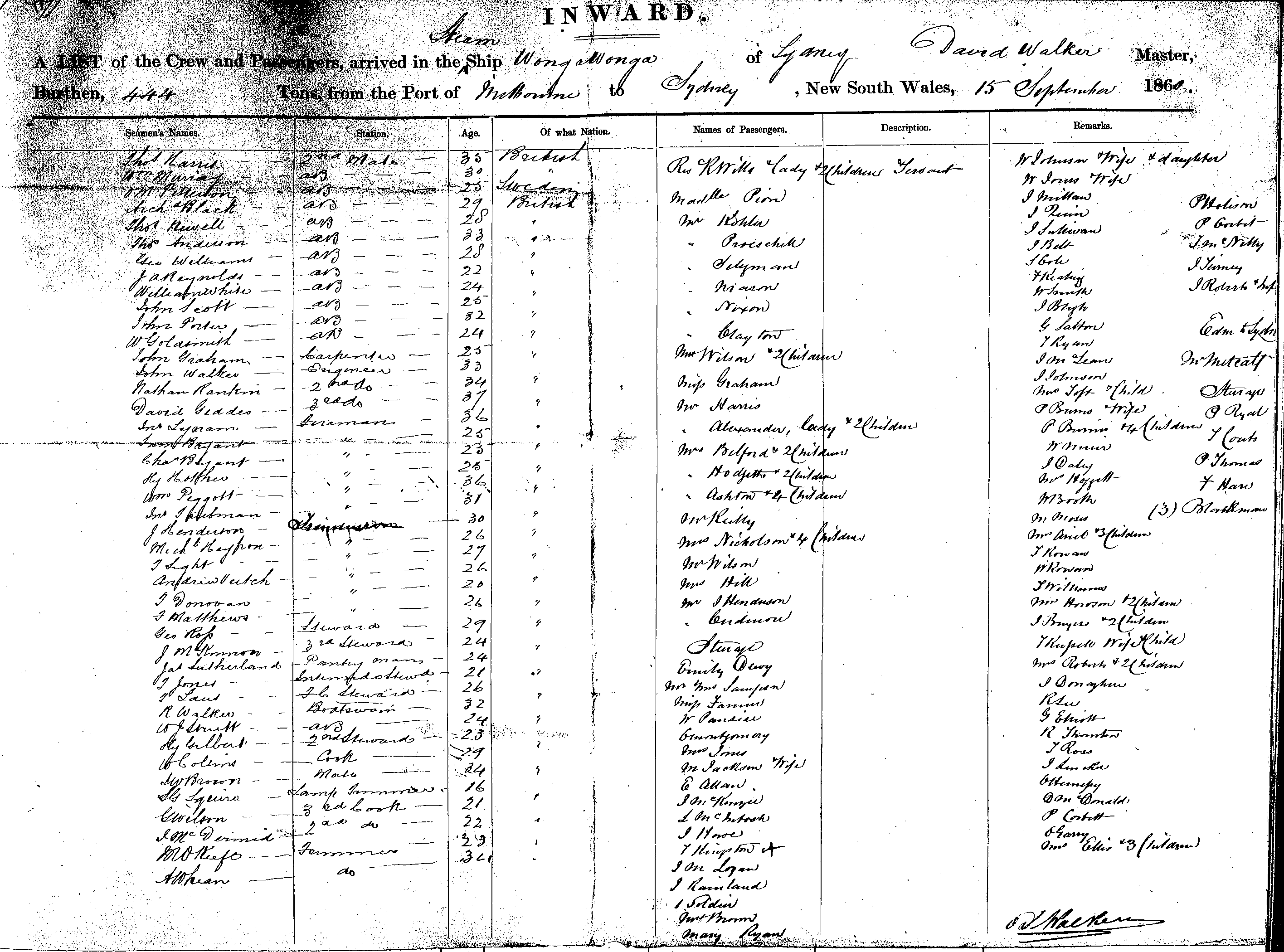 WONGA WONGASTEAMSHIP, OF SYDNEY, DAVID WALKER, MASTER, BURTHEN 444 TONS FROM THE PORT OF MELBOURNE, VICTORIA TO SYDNEY, NEW SOUTH WALES, 15TH SEPTEMBER 1860 |