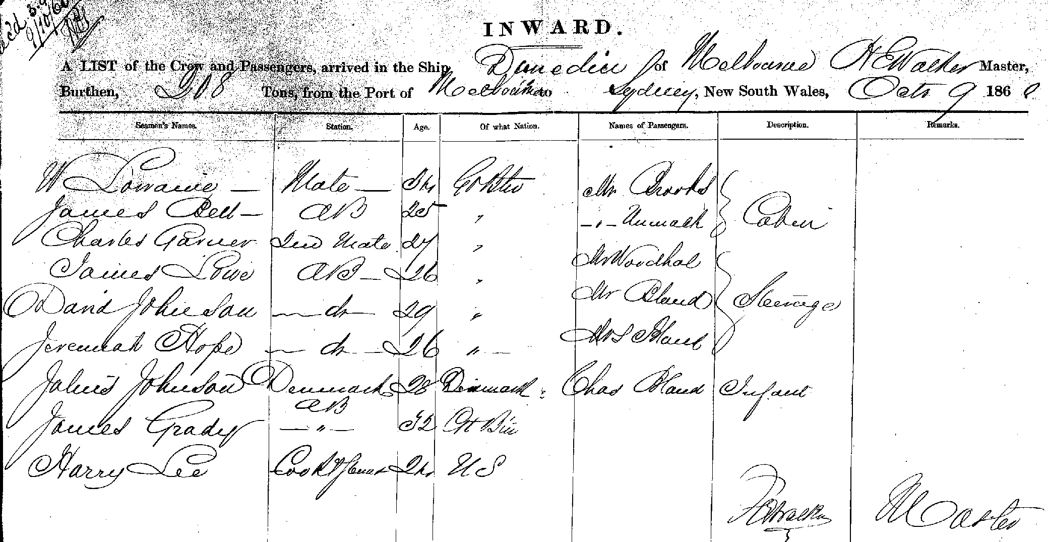 DUNEDINOF MELBOURNE, H. E. WALKER, MASTER, BURTHEN 208 TONS FROM THE PORT OFMELBOURNE TO SYDNEY, NEW SOUTH WALES, 9TH OCTOBER 1860 |