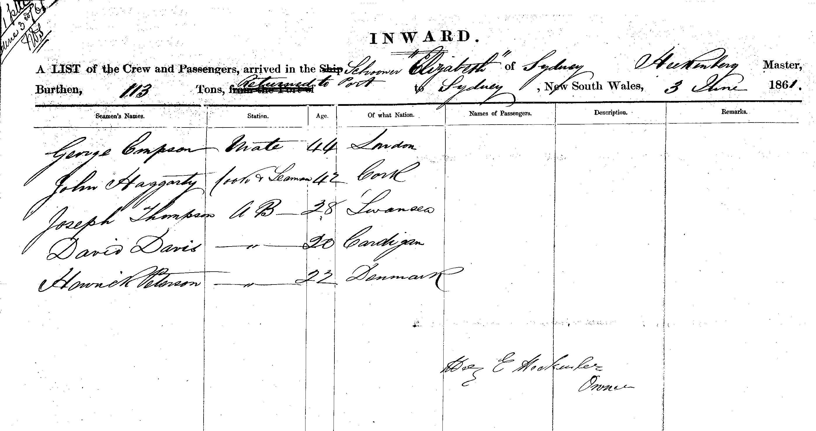 ELIZABETHSCHOONER OF SYDNEY, ?. H. HEIKINBERG MASTER, BURTHEN 113 TONS RETURNED TO PORT, TO SYDNEY NSW, 3RD JUNE 1861 |