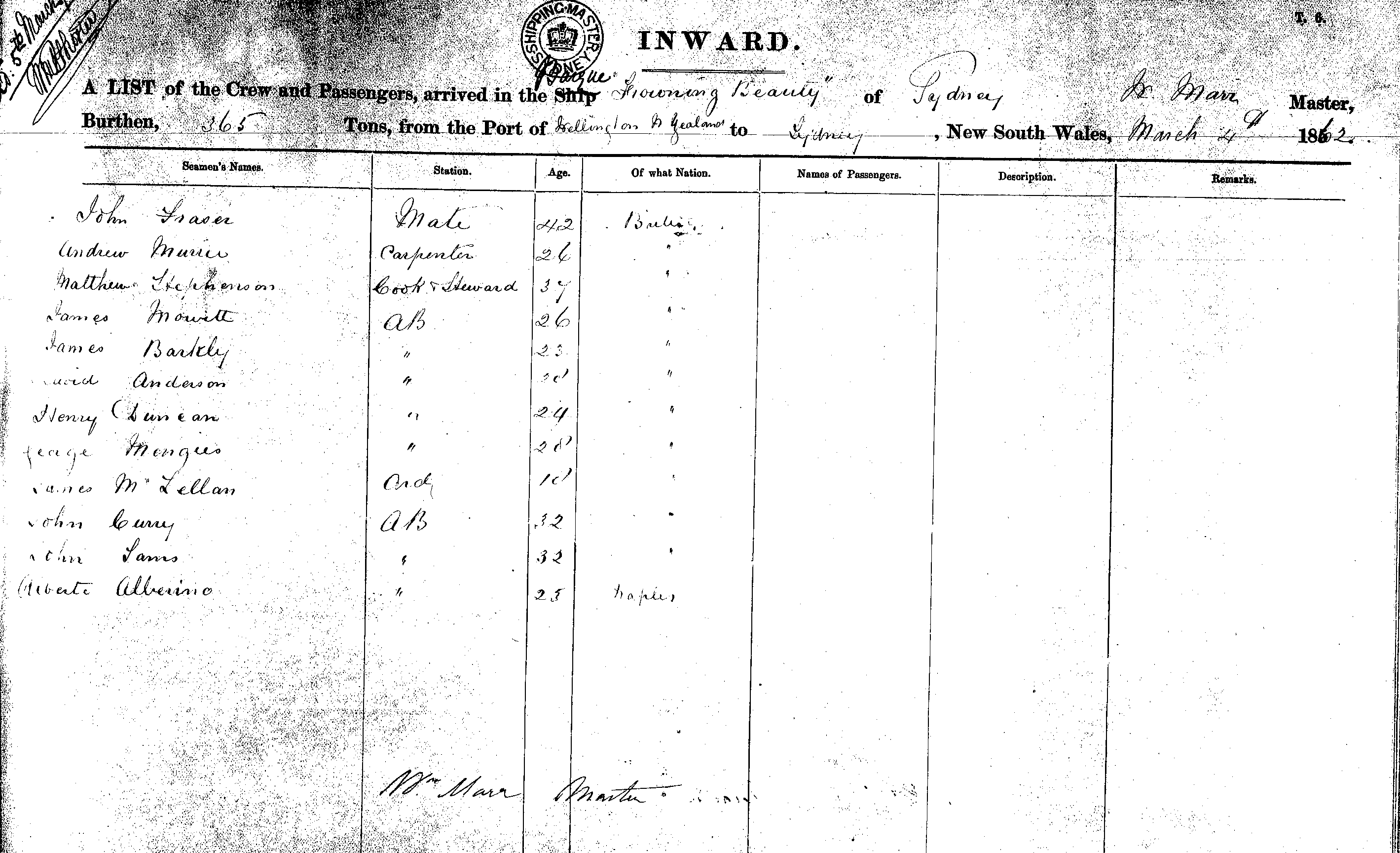 FROWNING BEAUTYBARQUE OF SYDNEY, Wm MARR MASTER, BURTHEN 365 TONS FROM THE PORT OF WELLINGTON NZ TO SYDNEY, NEW SOUTH WALES, 4th MARCH, 1862 |