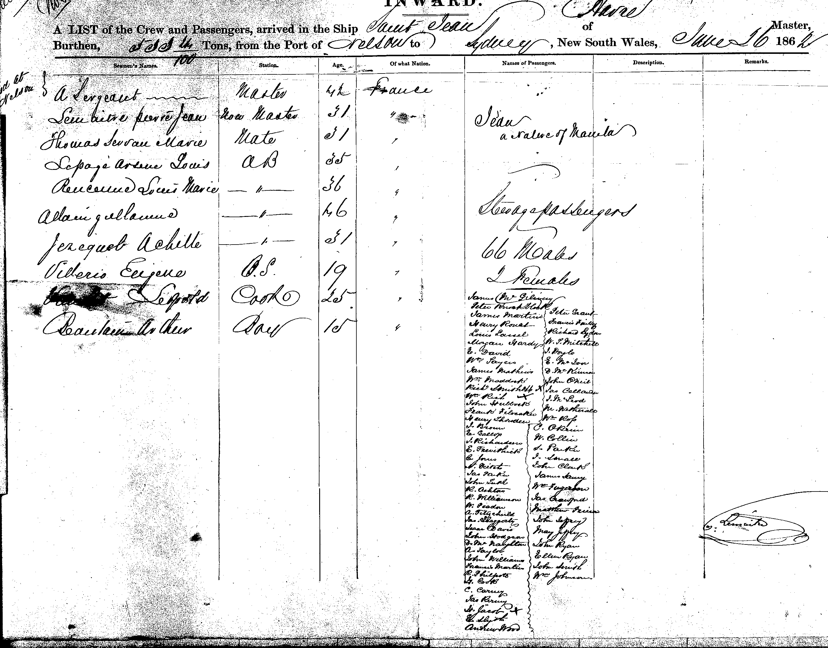 SAINT JEANOF HAVRE, A SERGEANT, MASTER, BURTHEN 533+ TONS FROM THE PORT OF NELSON TO SYDNEY, NEW SOUTH WALES, 26 JUNE, 1862 |