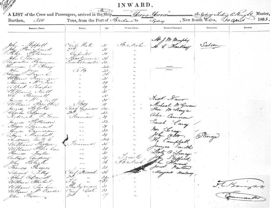 YARRA YARRASTEAMSHIP of SYDNEY, FESTING C. KNIGHT, MASTER, BURTHEN 350 TONS from the port of BRISBAINE to SYDNEY, NEW SOUTH WALES, 30th APRIL 1863 |