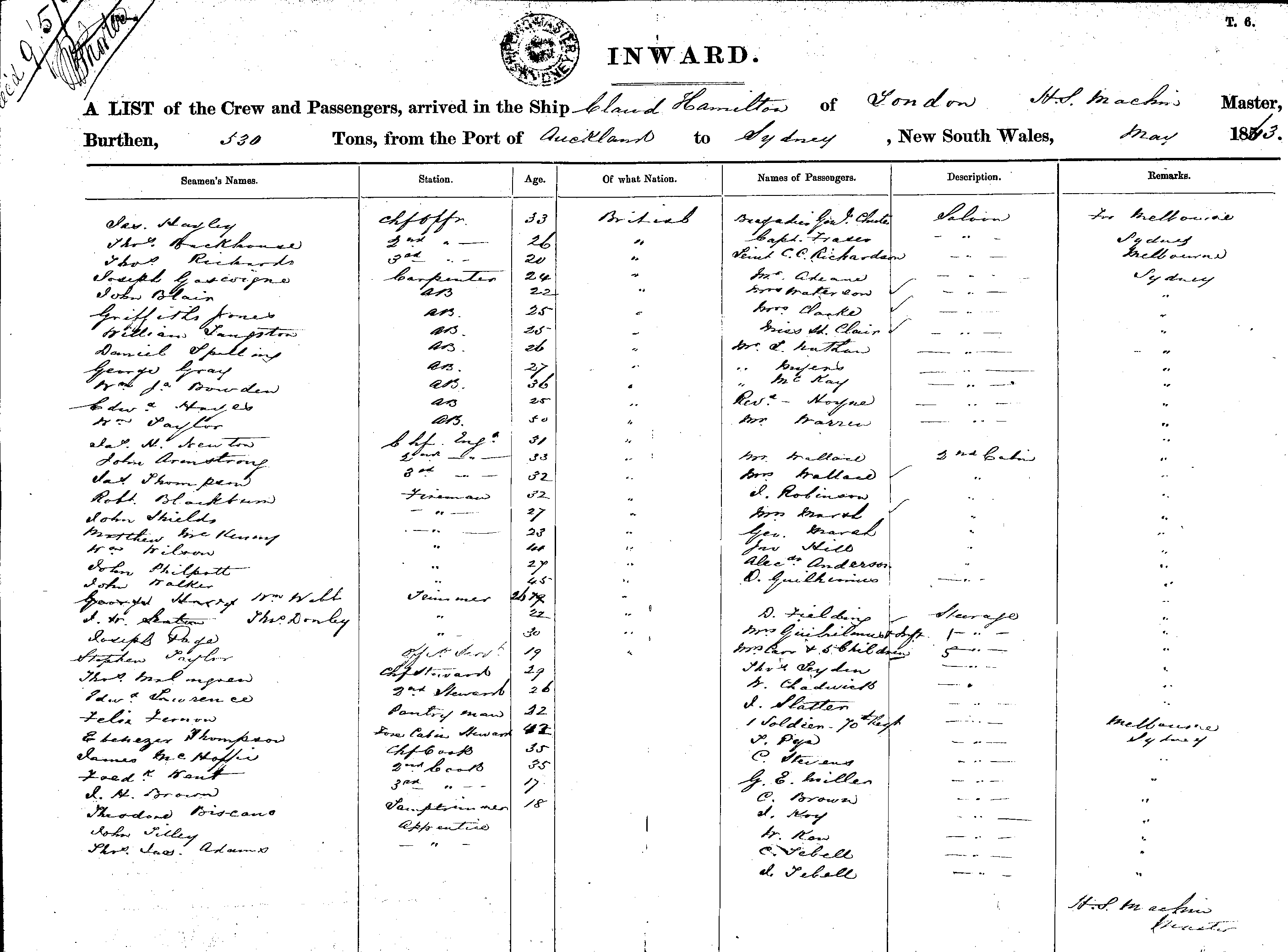 CLAUD HAMILTONOF LONDON, H.S. MACKIN, MASTER, BURTHEN 530 TONS FROM THE PORT OF AUCKLAND TO SYDNEY, NEW SOUTH WALES, MAY 1863 |