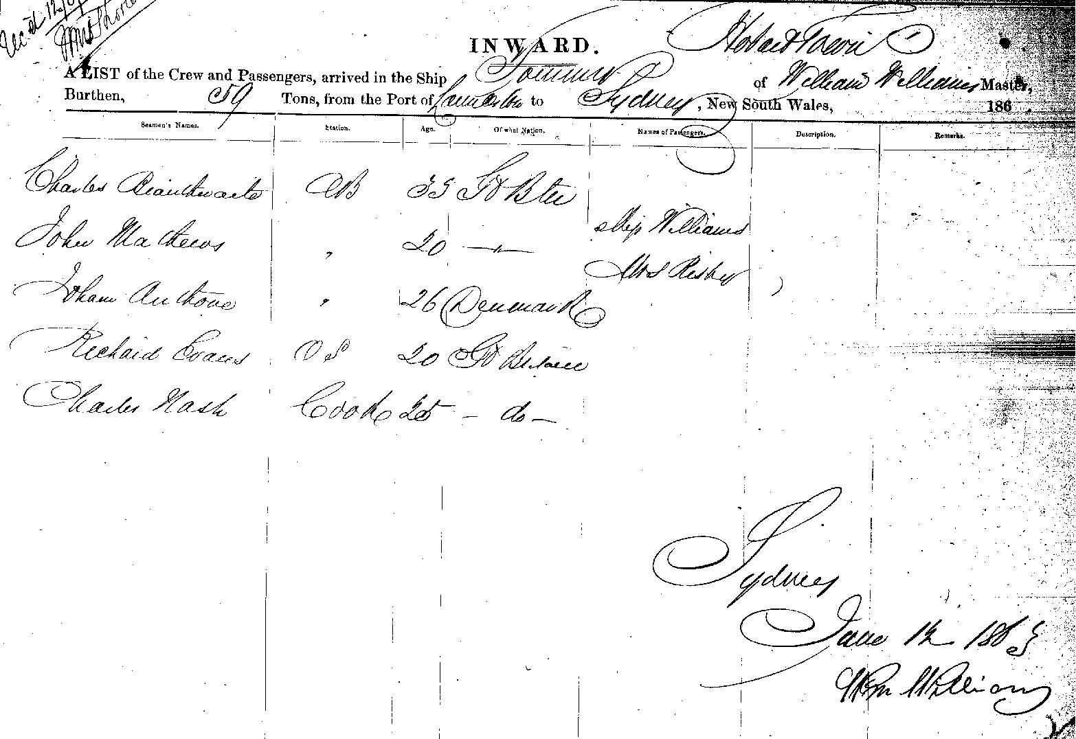 TOMMYOF HOBART TOWN, WILLIAM WILLIAMS, MASTER, BURTHEN 59 TONS FROM THE PORT OF LAUNCESTON TO SYDNEY, NEW SOUTH WALES, JUNE 12TH 1863 |