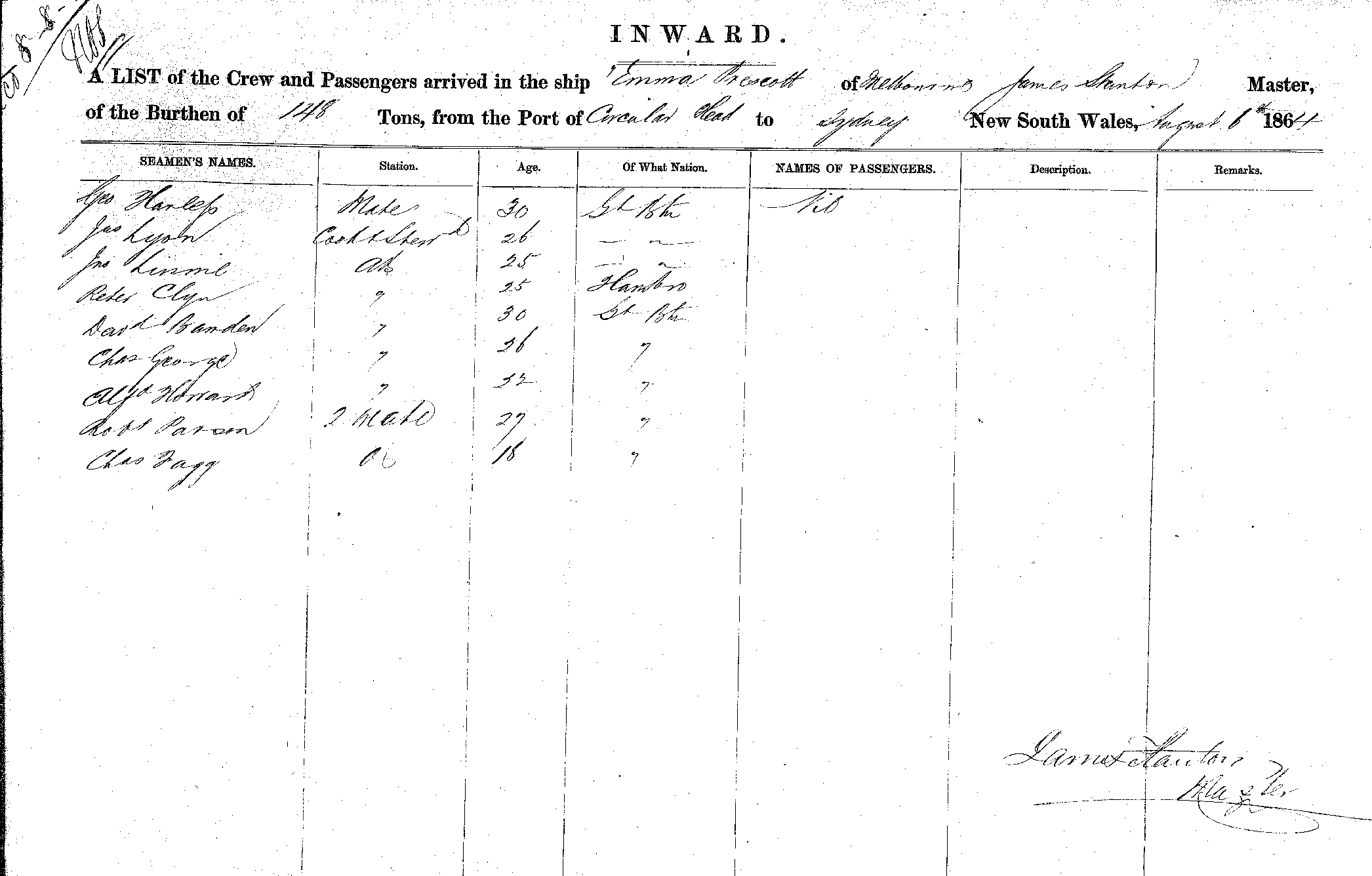 FROM THE PORT OF CIRCULAR HEAD TO SYDNEY 6 AUGUST 1864