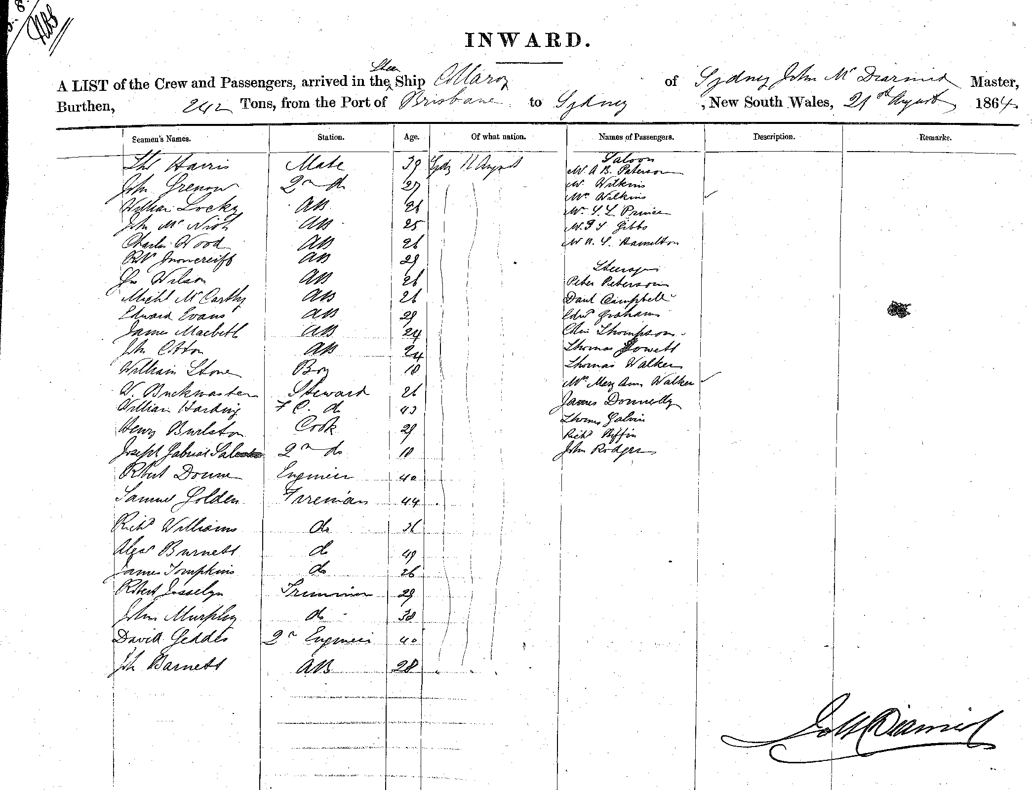 FROM THE PORT OF BRISBANE TO SYDNEY 21 AUGUST 1864