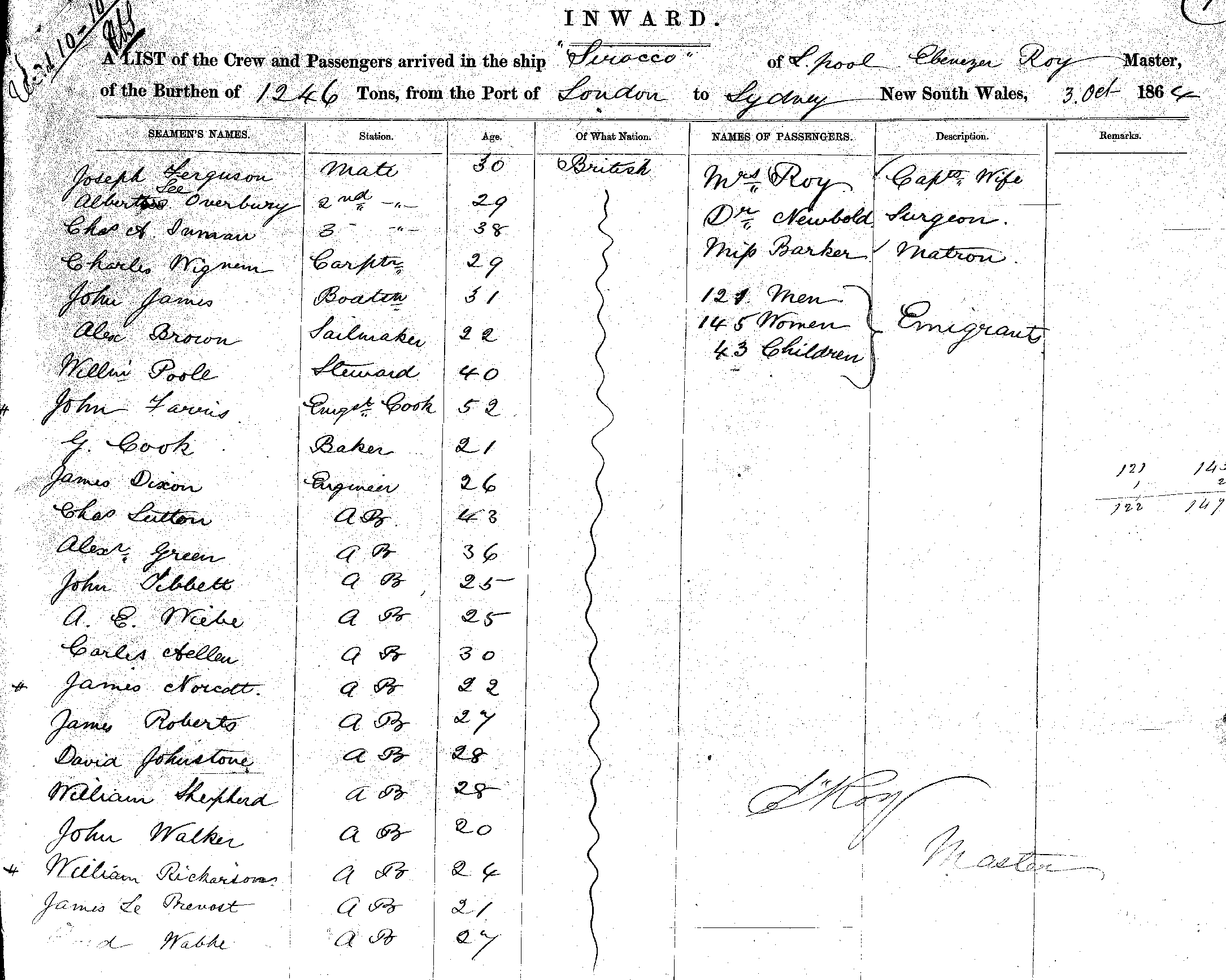 SIRIOCCOOF LPOOL, EBENEZER ROY, MASTER, BURTHEN 1246 TONS FROM THE PORT OF LONDON TO SYDNEY, NEW SOUTH WALES, 3RD OCTOBER 1864 |