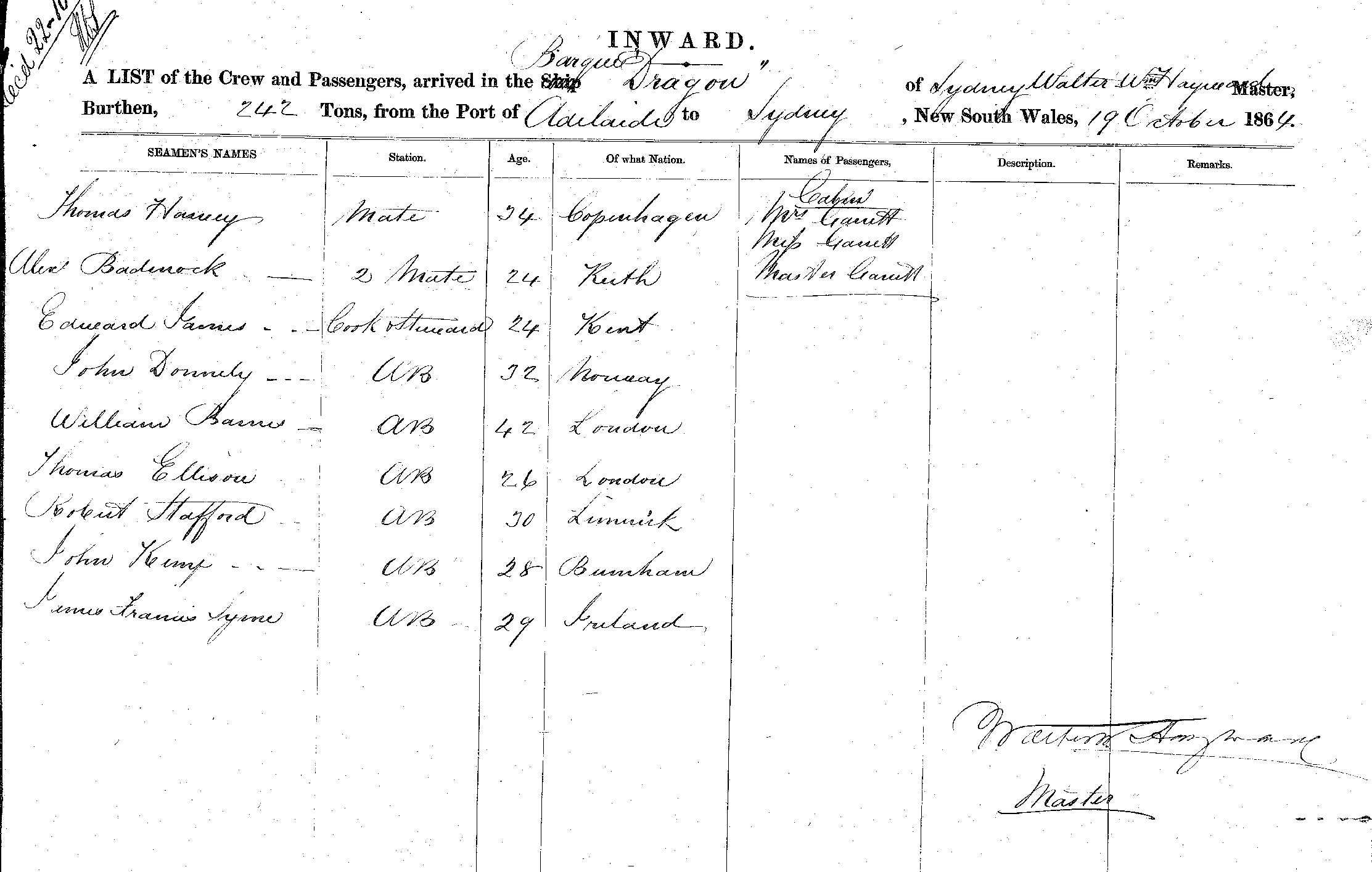 DRAGONOF SYDNEY, WALTER W. HAYWARD, MASTER, BURTHEN 242TONS FROM THE PORT OF ADELAIDE TO SYDNEY, NEW SOUTH WALES, 19TH OCTOBER 1864 |