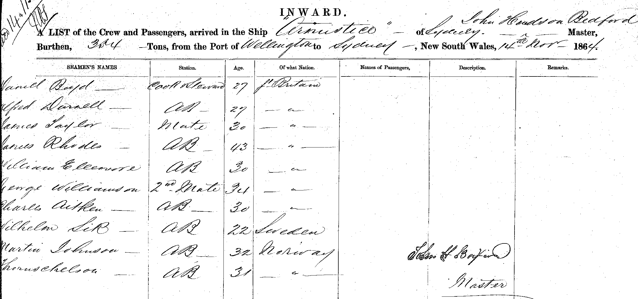 ARMISTICEOF SYDNEY, JOHN H. BEDFORD, MASTER, BURTHEN 354 TONS FROM THE PORT OF WELLINGTON TO SYDNEY, NEW SOUTH WALES, 14TH NOVEMBER 1864 |