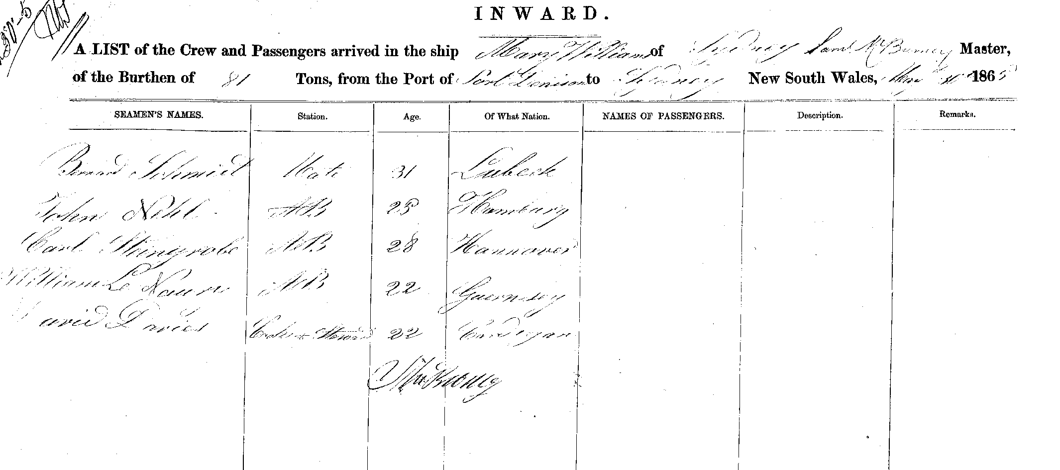 MARY WILLIAMSOF SYDNEY, SAMUEL MCBURNEY, MASTER, BURTHEN 81 TONS FROM THE PORT OF PORT DENISON TO SYDNEY, NEW SOUTH WALES, 30TH MAY 1865 |