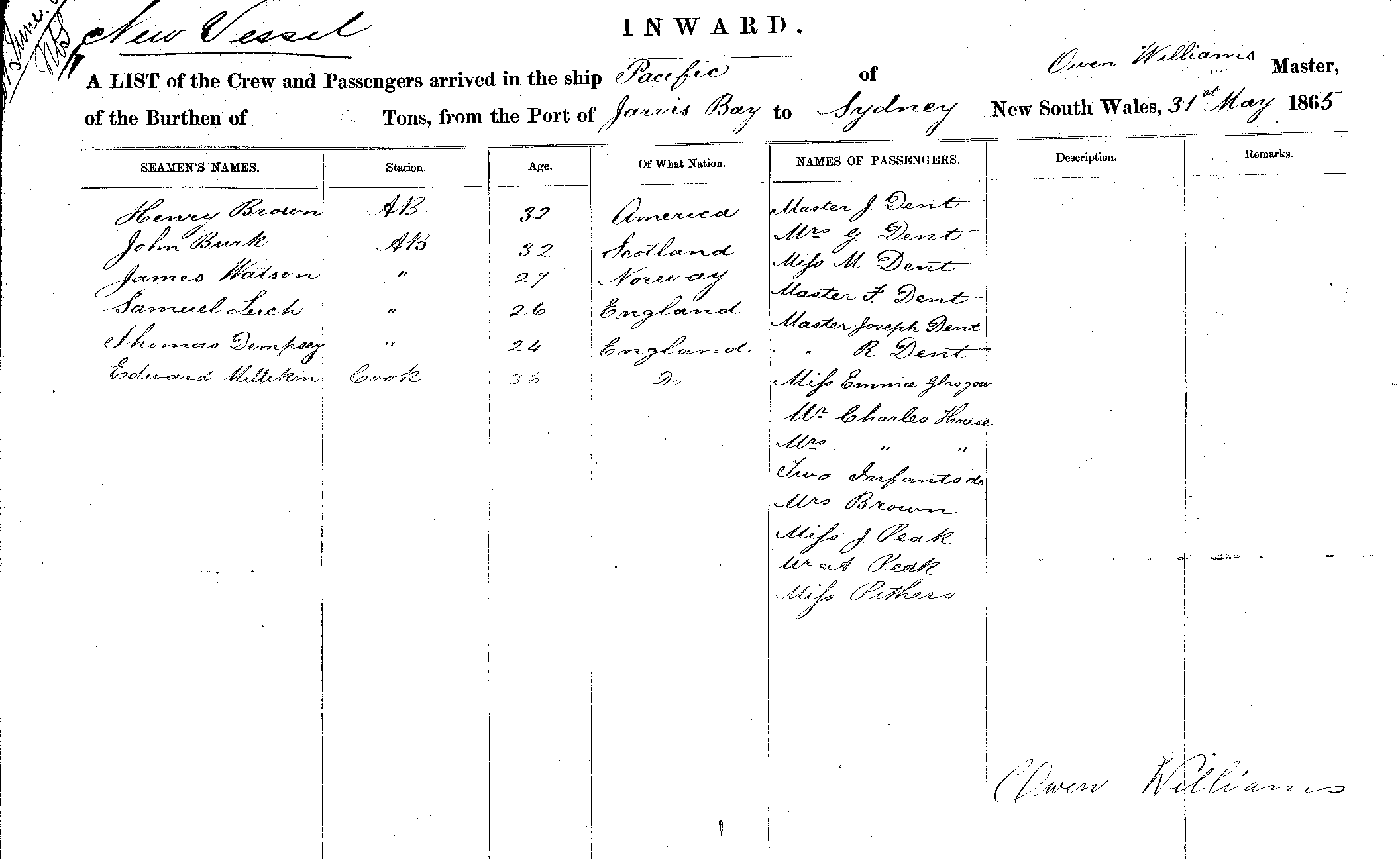 PACIFICOF ?, OWEN WILLIAMS, MASTER, BURTHEN ? TONS FROM THE PORT OF JARVIS BAY TO SYDNEY, NEW SOUTH WALES, 31ST MAY 1865 |