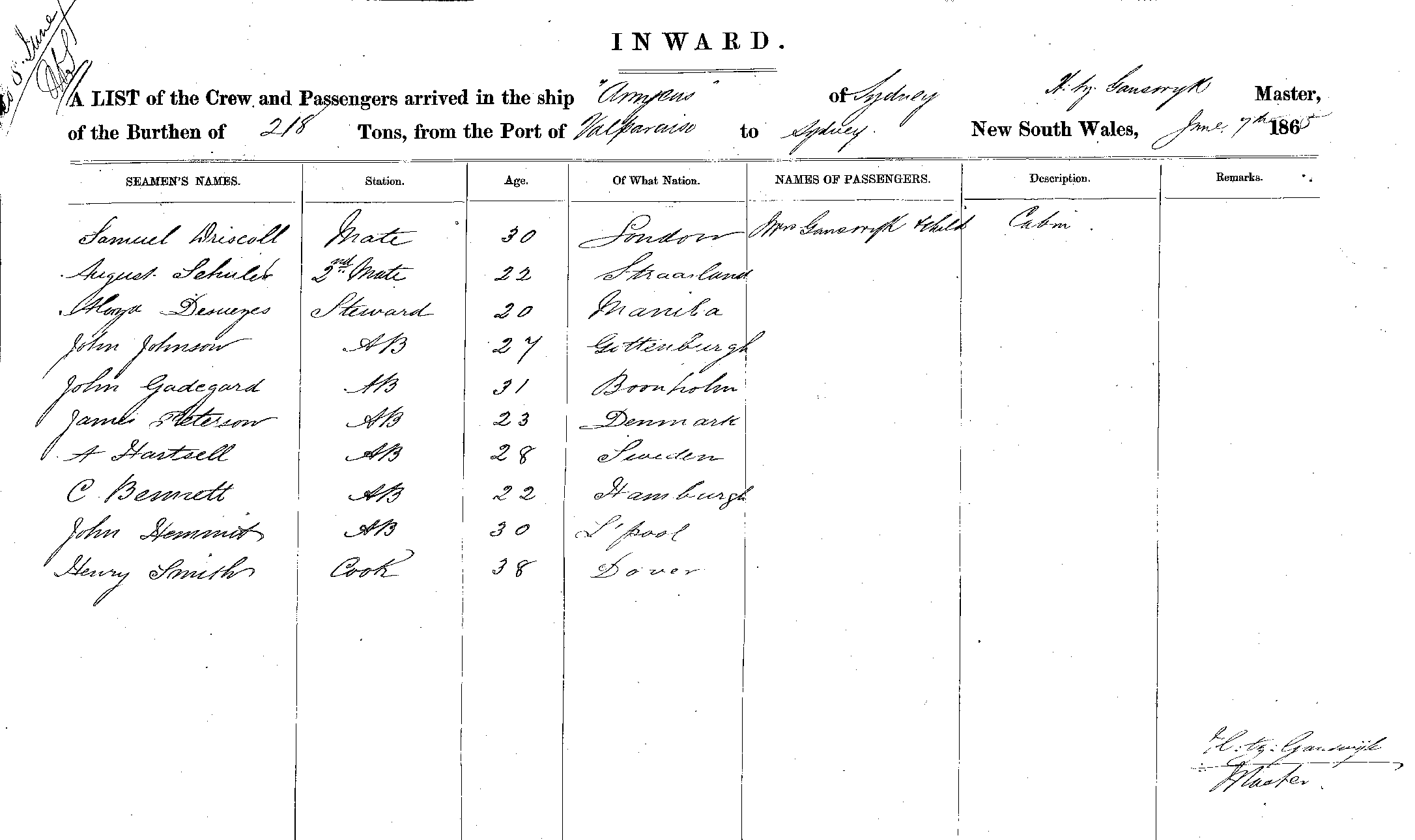 AMYCUSOF SYDNEY, H. GANSORYK, MASTER, BURTHEN 218 TONS FROM THE PORT OF VALPARAISE TO SYDNEY, NEW SOUTH WALES, 7 JUNE 1865 |