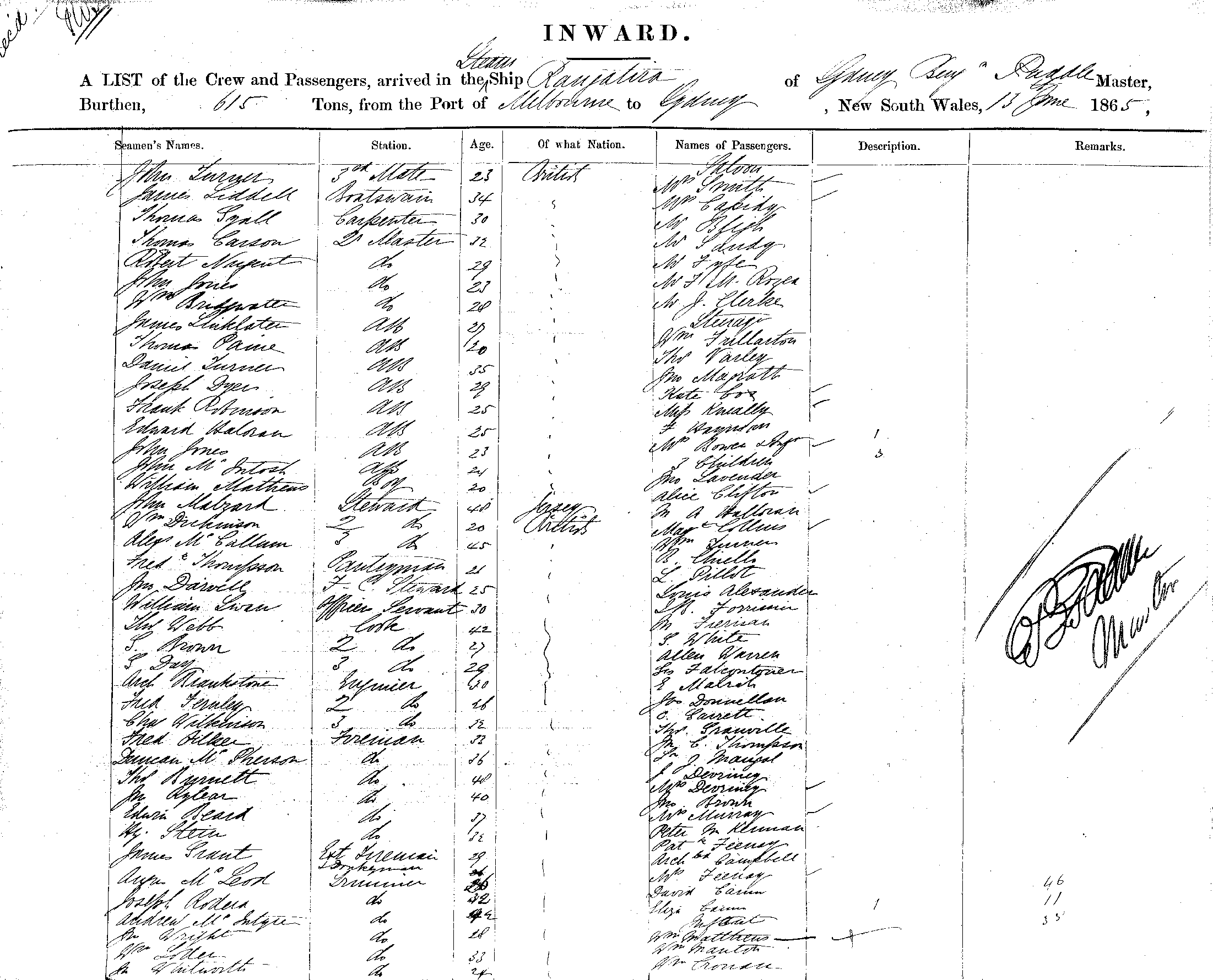 RANGATIRAOF SYDNEY, BENJ PUDDLE, MASTER, BURTHEN 615 TONS FROM THE PORT OF MELBOURNE TO SYDNEY, NEW SOUTH WALES, 13 JUNE 1865 |