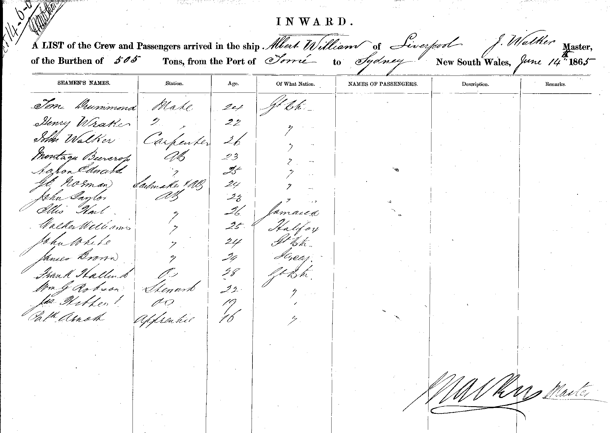 ALBERT WILLIAMOF LIVERPOOL, J. WALKER, MASTER, BURTHEN 505 TONS FROM THE PORT OF TOME' TO SYDNEY, NEW SOUTH WALES, 14 JUNE 1865 |