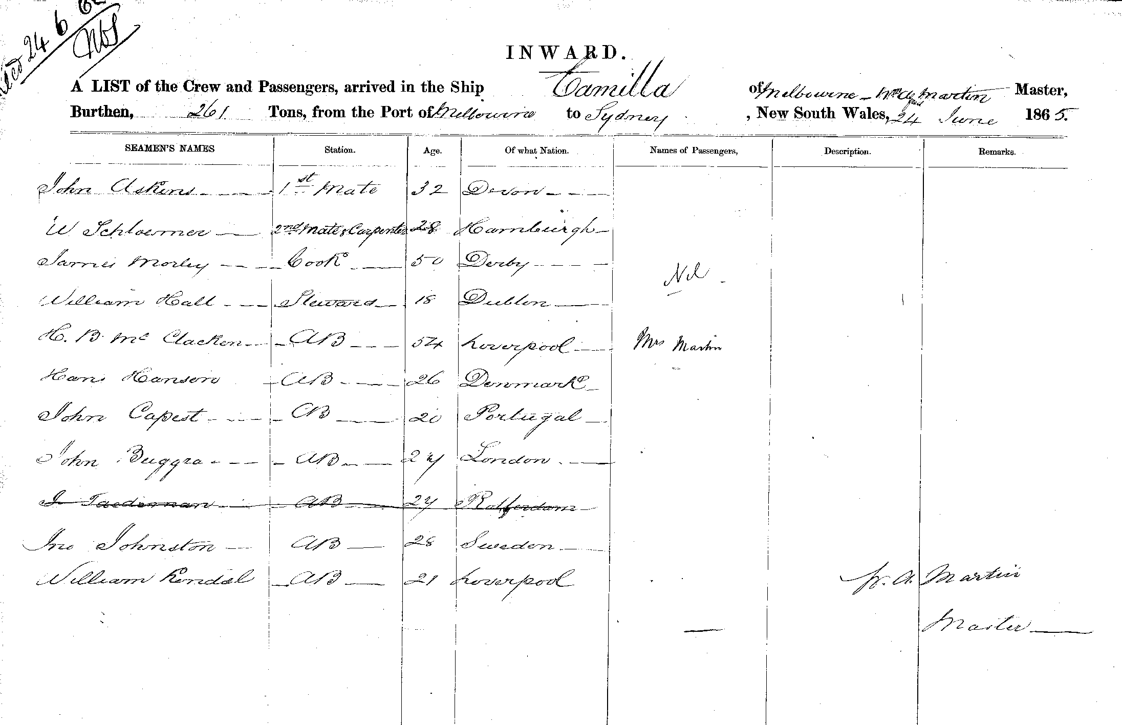 CAMILLAOF MELBOURNE, WM. A. MARTIN, MASTER, BURTHEN 261 TONS FROM THE PORT OF MELBOURNE TO SYDNEY, NEW SOUTH WALES, 24TH JUNE 1865 |