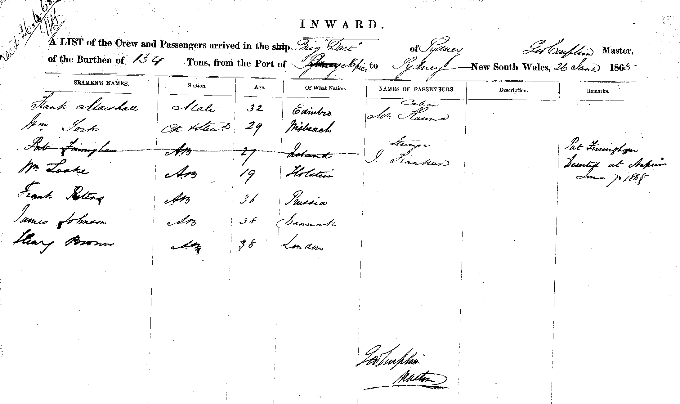 DARTOF SYDNEY, GEO. CARPLIM, MASTER, BURTHEN 154 TONS FROM THE PORT OF NAPIER TO SYDNEY, NEW SOUTH WALES, 26 JUNE 1865 |