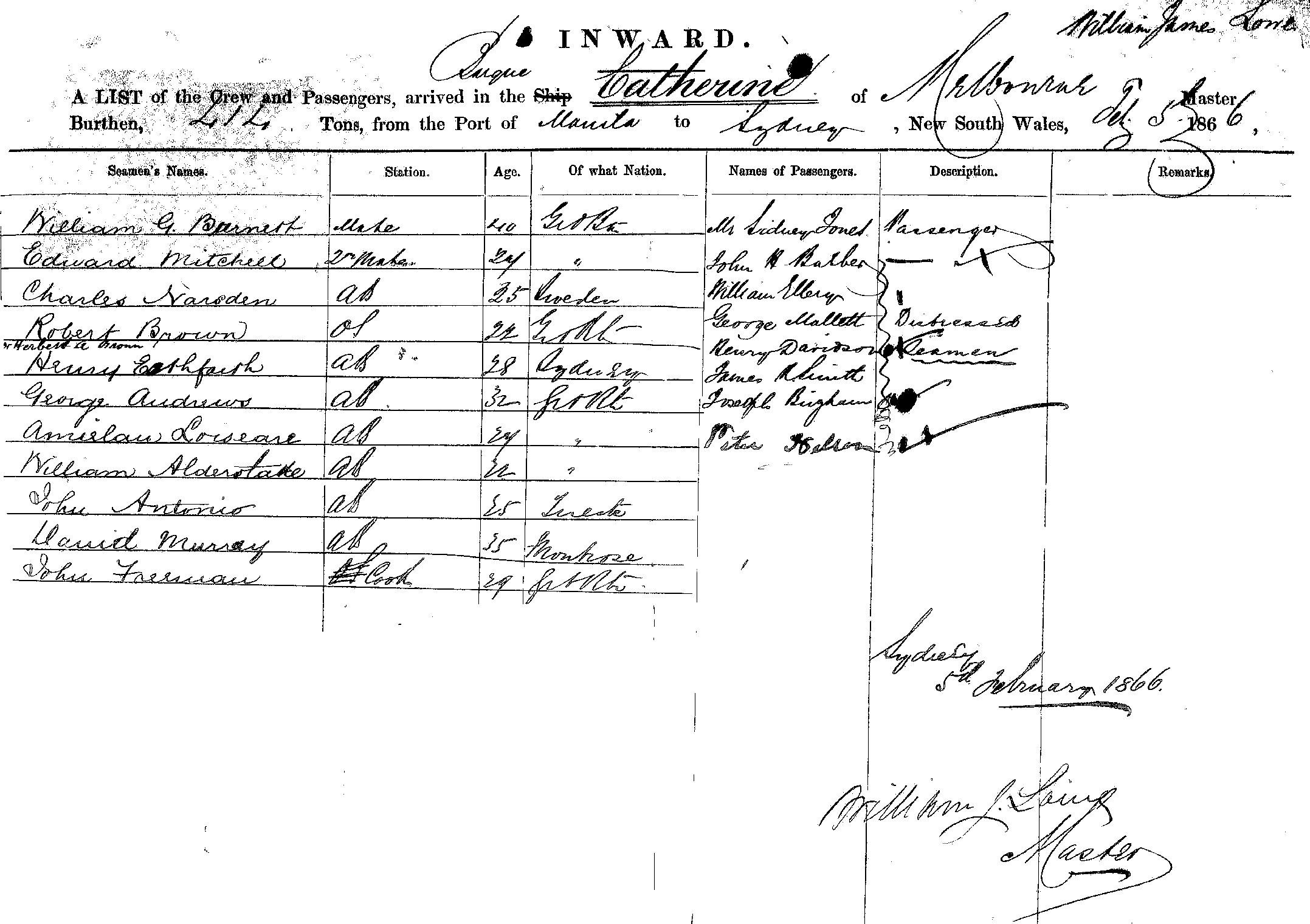 CATHERINEBARQUE, OF MELBOURNE, WILLIAM JAMES LOWE, MASTER, BURTHEN 414 TONS FROM THE PORT OF MANILA TO SYDNEY, NEW SOUTH WALES, 5TH FEB. 1866 |