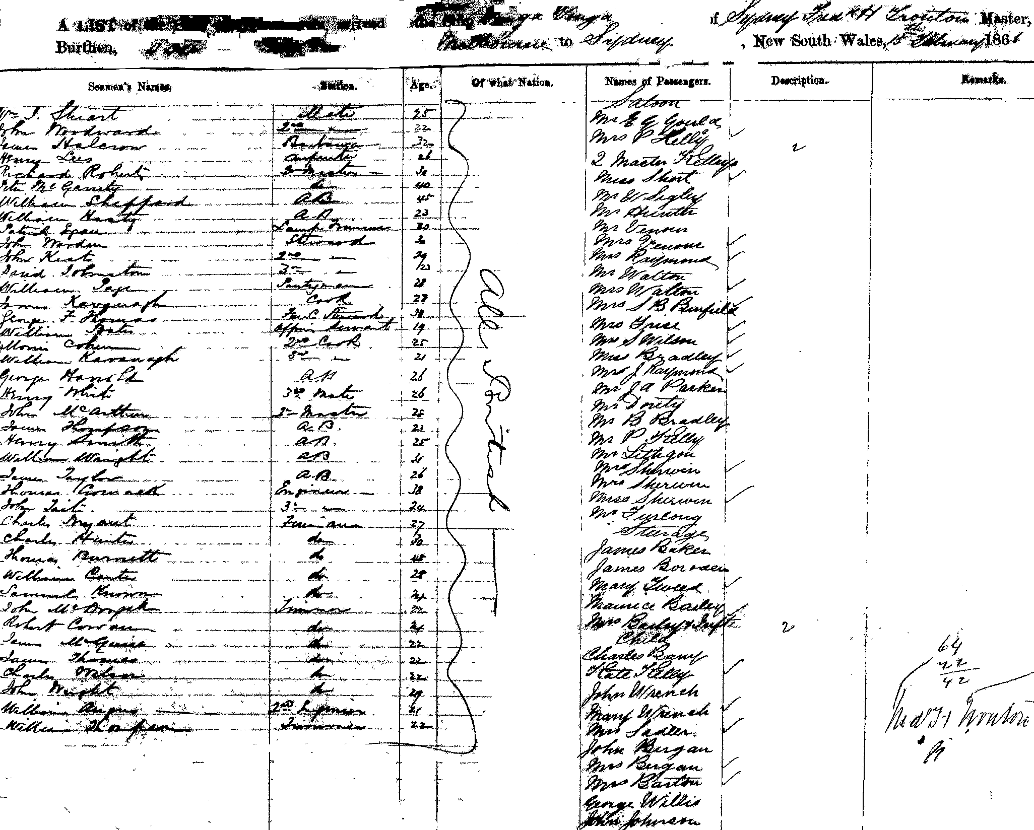 WONGA WONGAOF SYDNEY, FREDERICK H. TROUTON, MASTER, BURTHEN 444 TONS FROM THE PORT OF MELBOURNE TO SYDNEY, NEW SOUTH WALES, 15TH FEB. 1866 |