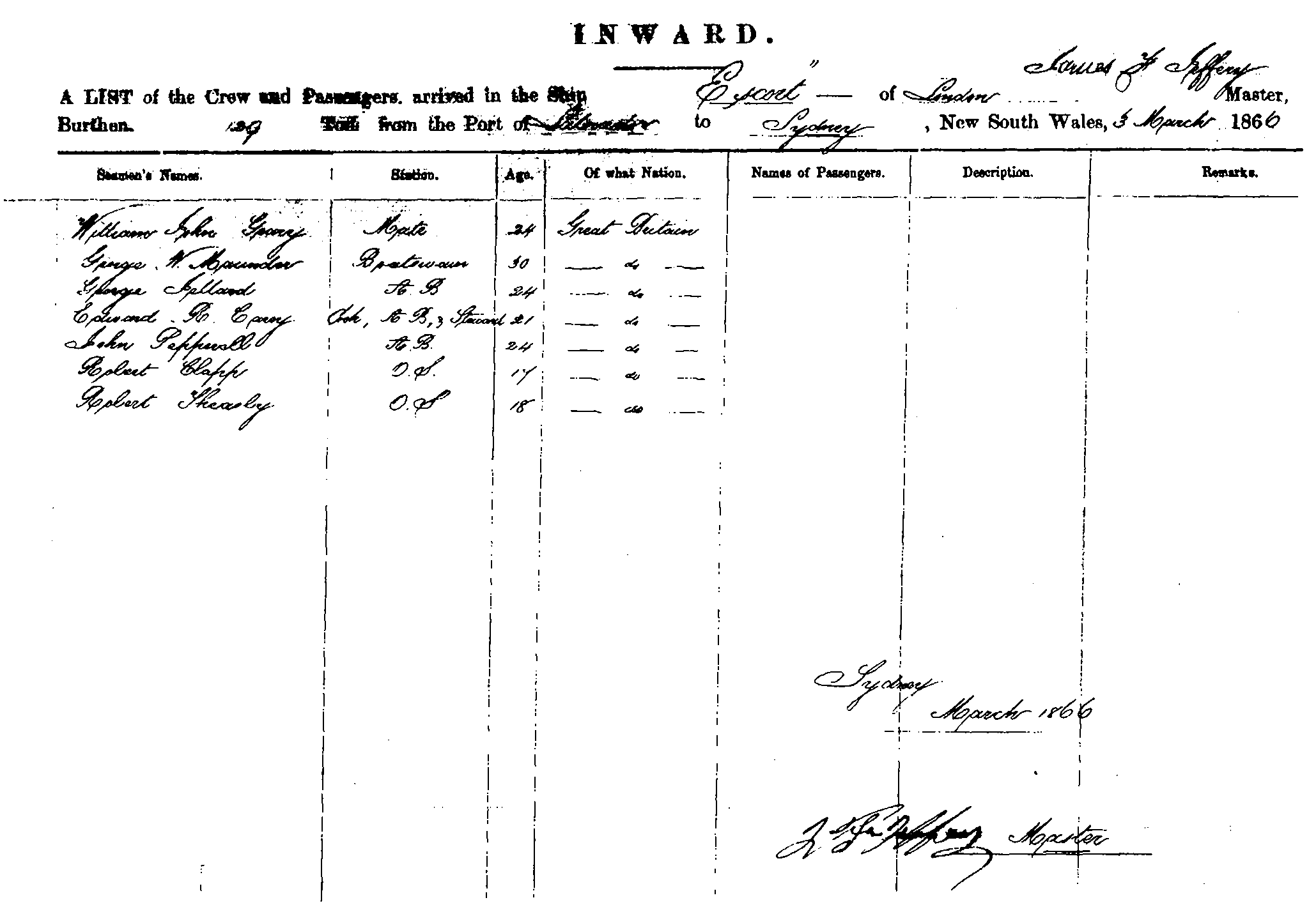 ESCORTOF LONDON, JAMES F. JEFFERY, MASTER, BURTHEN 129 TONS FROM THE PORT OF LABRADOR TO SYDNEY, NEW SOUTH WALES, 3RD MAR. 1866 |