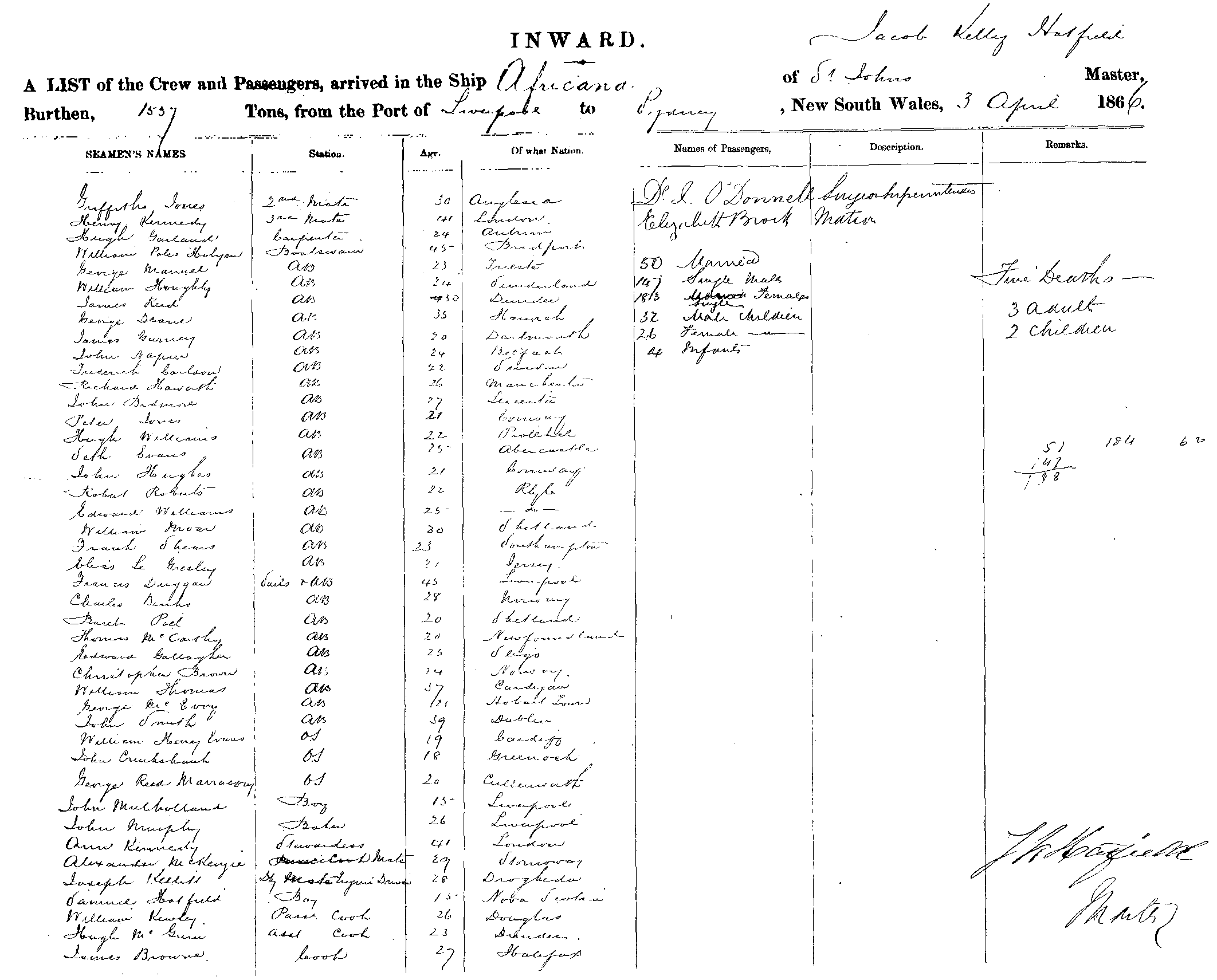 AFRICANAOF ST. JOHNS, JACOB KELLY HATFIELD, MASTER, BURTHEN 1537 TONS FROM THE PORT OF LIVERPOOL TO SYDNEY, NEW SOUTH WALES, 3RD APR. 1866 |